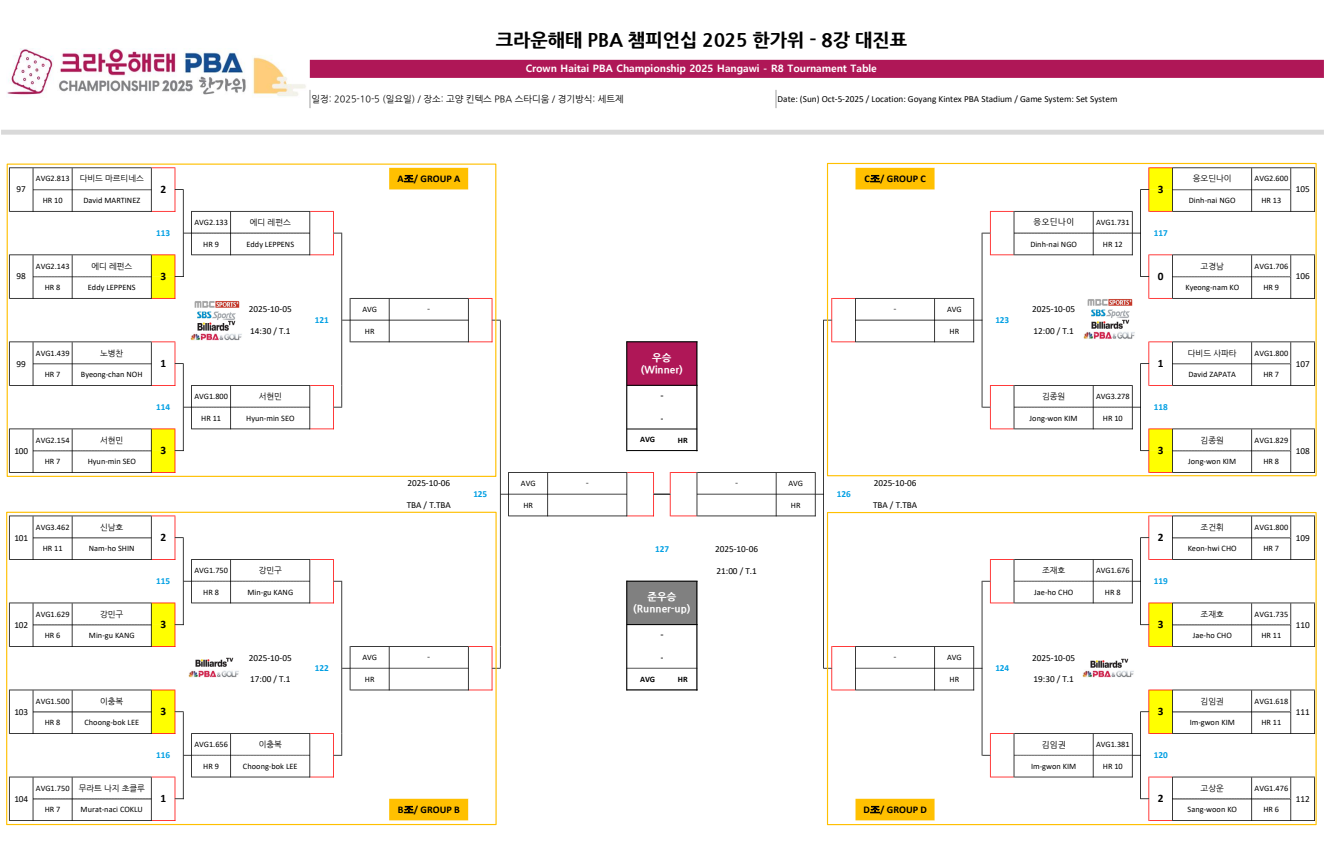 오늘은 프로당구 2025-26시즌, 크라운해태 PBA 챔피언십 2025 한가위 16강 경기결과에따른 8강 대진표를 정리하였습니다.