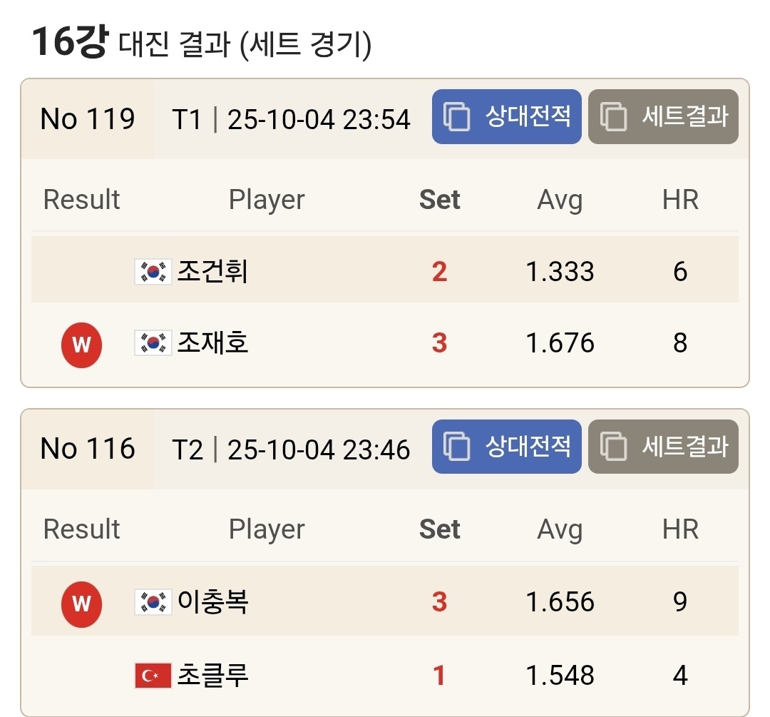 그럼 지금부터 크라운해태 PBA 챔피언십 2025 한가위 8강 대진표를 보기에 앞서 16강 경기결과를 먼저 살펴보겠습니다.