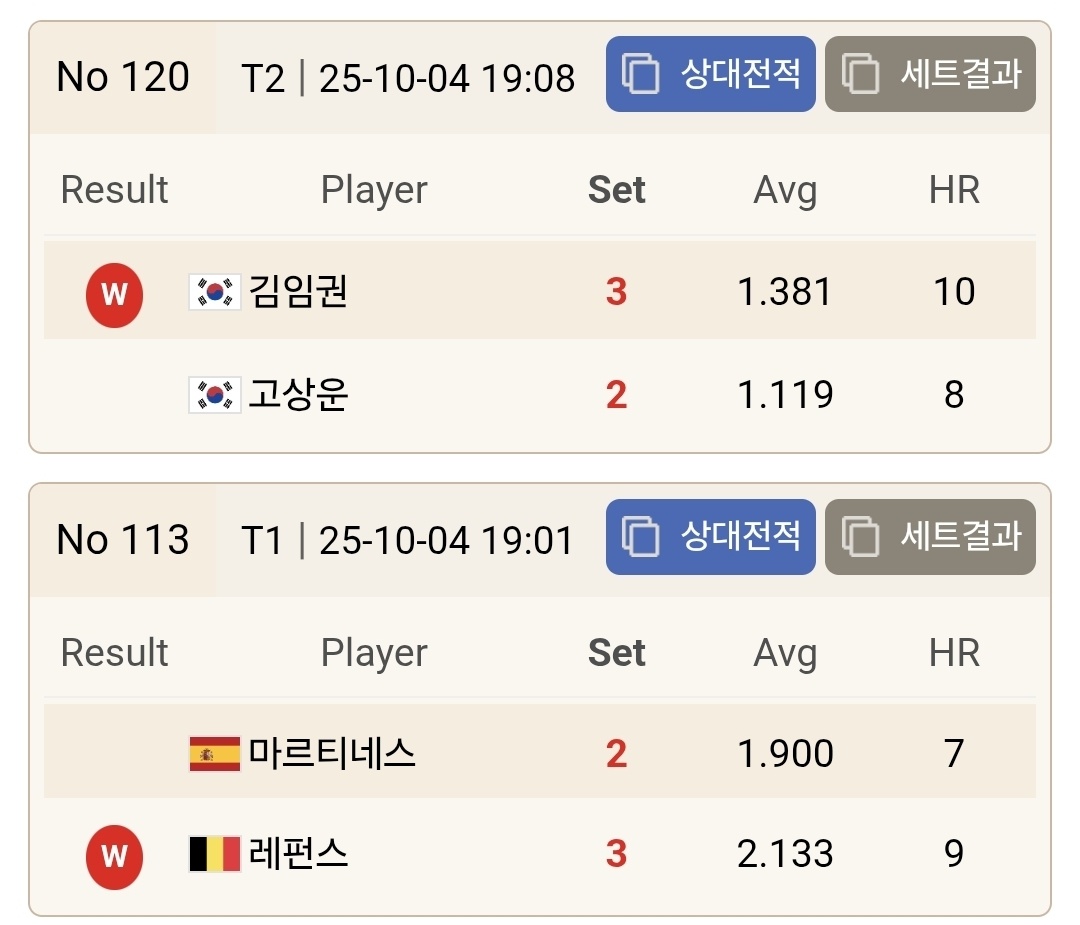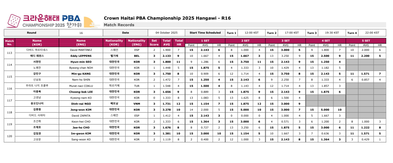 크라운해태 PBA 챔피언십 2025 한가위 16강 경기결과 입니다. 다비드 마르티네스가 에디 레펀스에게 3대 2로 패하면서 16강 진출이 좌좌절되었습니다. 또한 스페인의 강호 다비드 사파타도 김종원 선수에게 패하면서 탈락하였습니다.