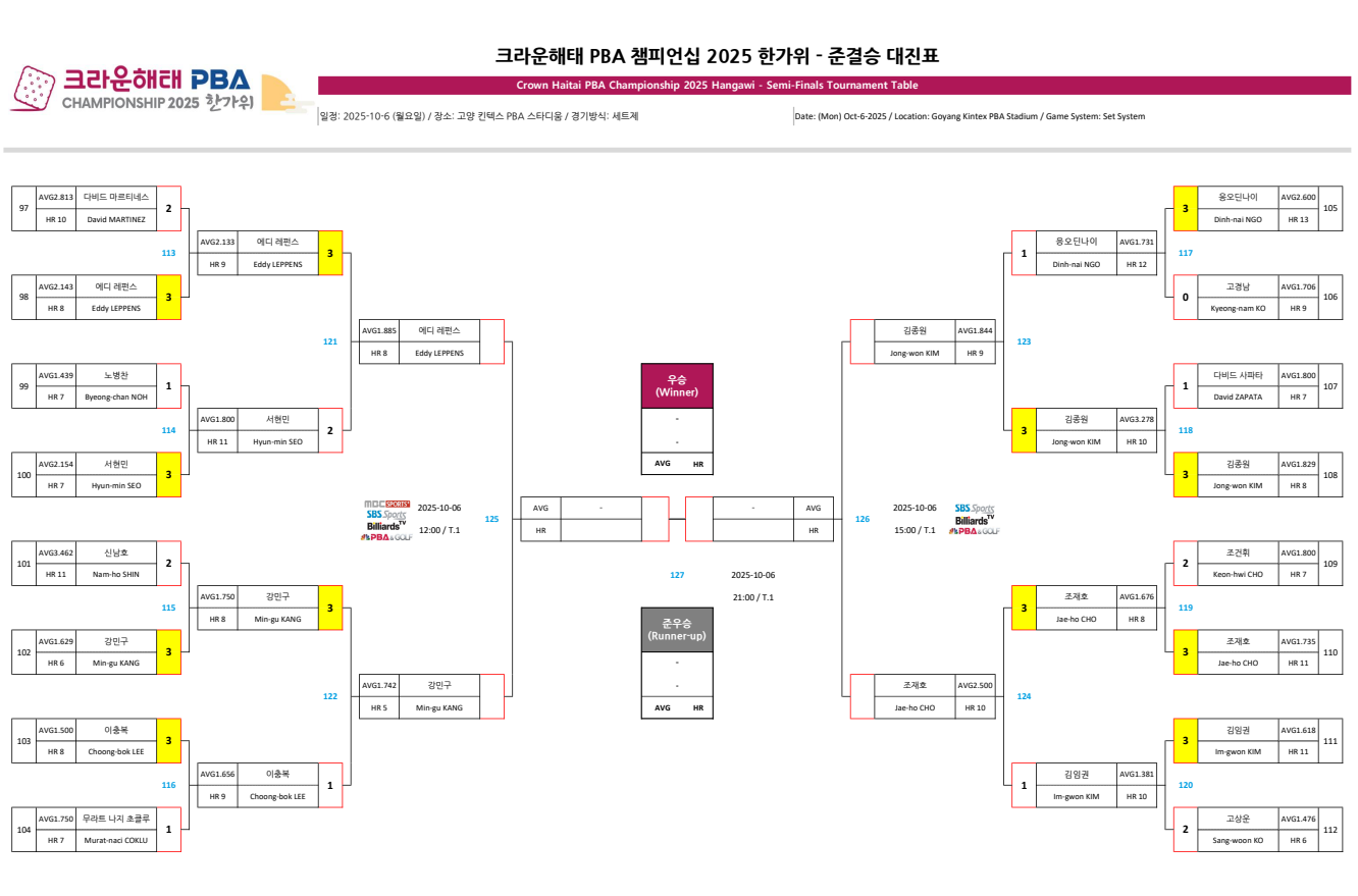 오늘은 프로당구 2025-26시즌, 크라운해태 PBA 챔피언십 2025 한가위 8강 경기결과에따른 4강 준결승 대진표를 정리하였습니다.