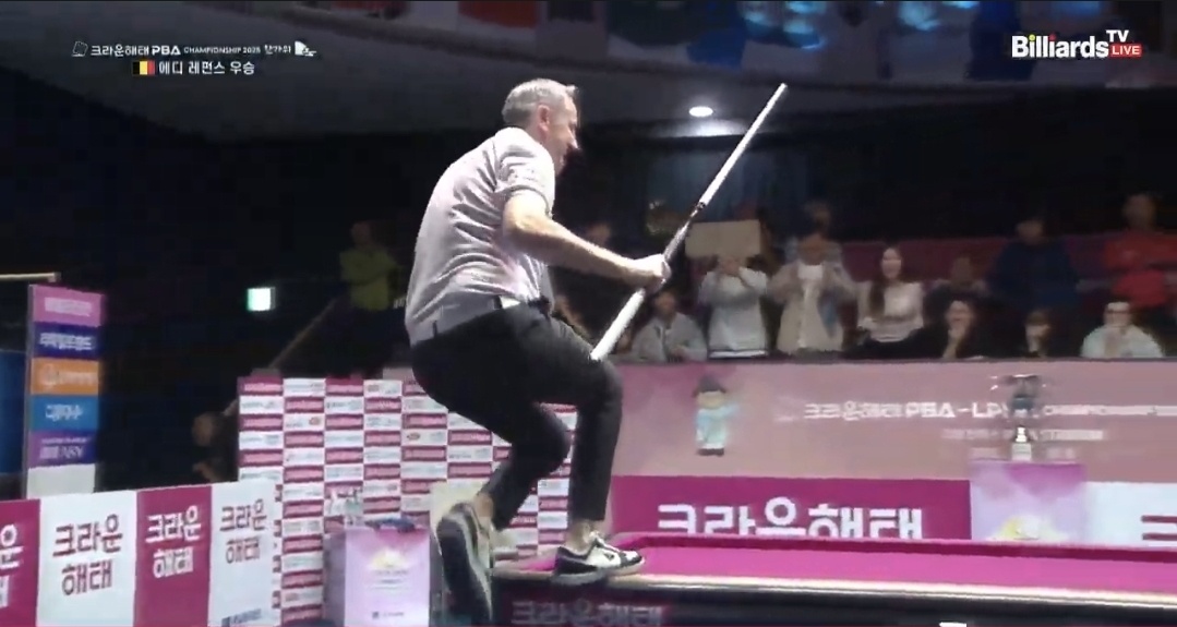 어쩌면 벨기에 당구선수, 에디 레펀스의 당구 인생에서 가장 감정이 폭발한 순간이었습니다. 관중석에서도 ‘레전드의 귀환’을 의미하는 함성이 터져 나왔습니다. 아무튼 당구대(당구테이블)에 뛰어 오르는 우승 세레모니는 이제 레펀스의 전매특허 퍼포먼스로 자리 잡을 것 같습니다.