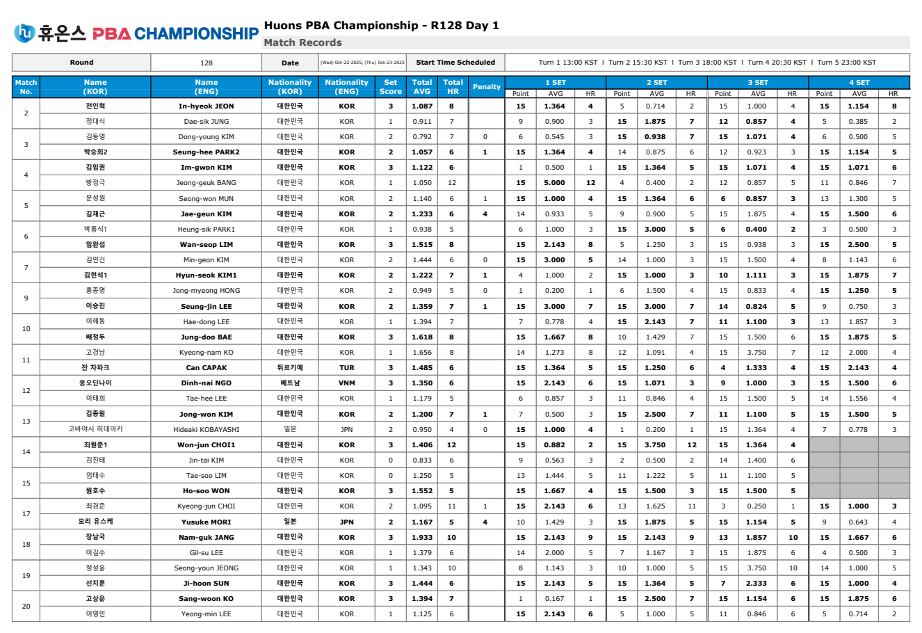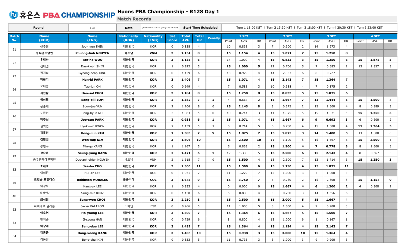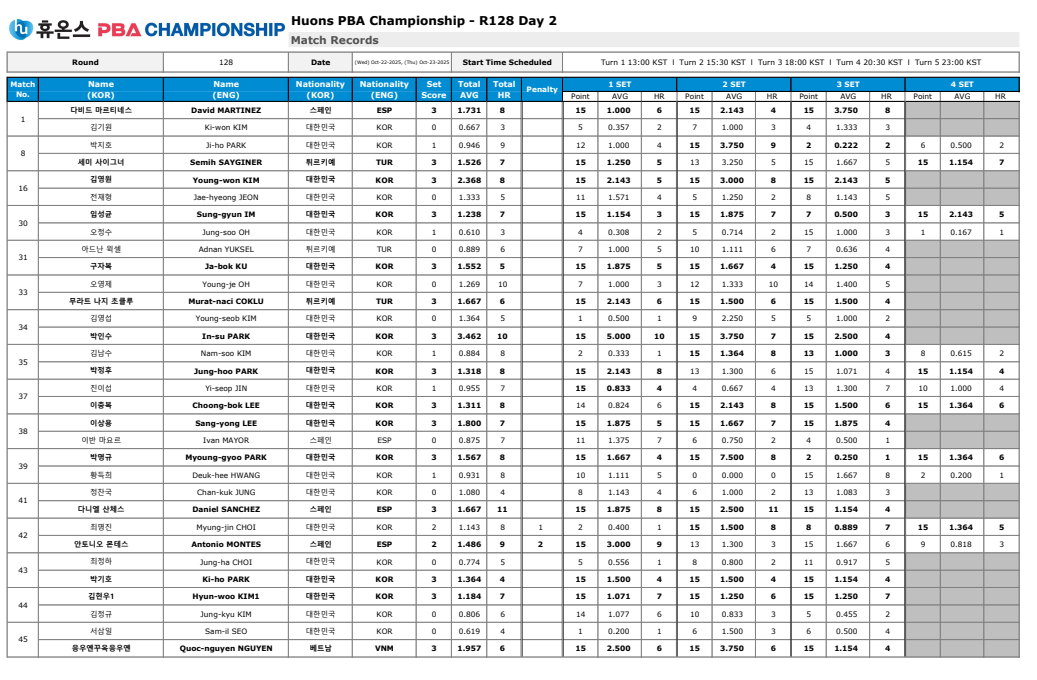 휴온스 PBA 챔피언십 128강 2일차 경기결과입니다. 긴영원, 세미 사이그너, 다니엘 산체스, 안토니오 몬테스 등이 이변없이 64강에 진출했습니다.