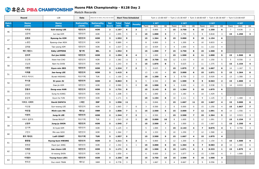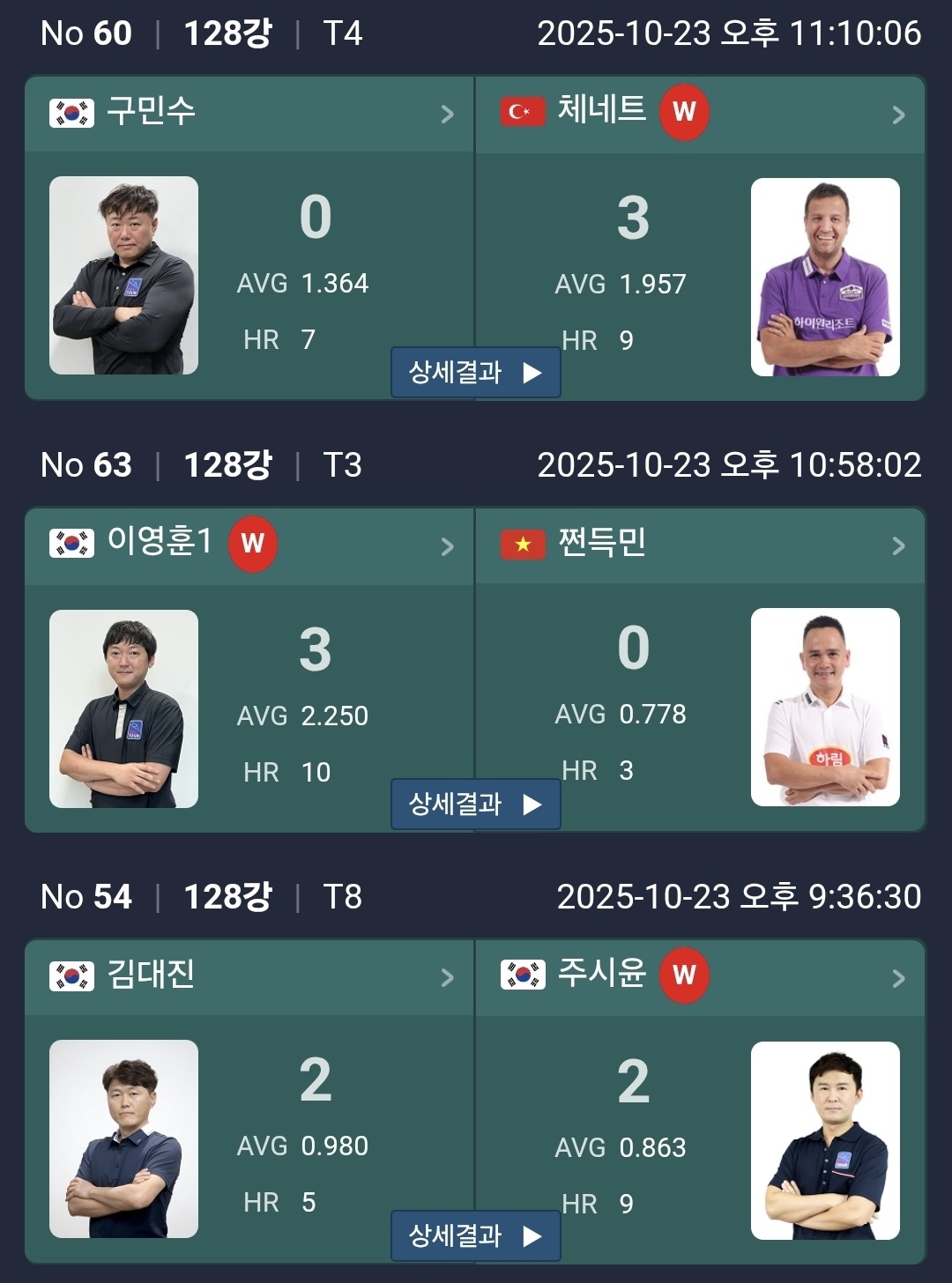 그외 선지훈, 김임권, 김재근, 고상운, 김홍민, 우태하, 이상대, 엉상필 선수도 64강에 진출하여 다음 기회를 노리게 되었습니다. 128강 1일차 경기에서 애버리지 2.0 이상을 기록한 선수는 최성원 선수 한 명 뿐입니다. 최성원 선수 이번대회 결승진출 가능할까요?