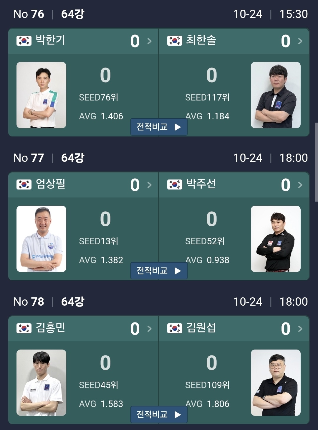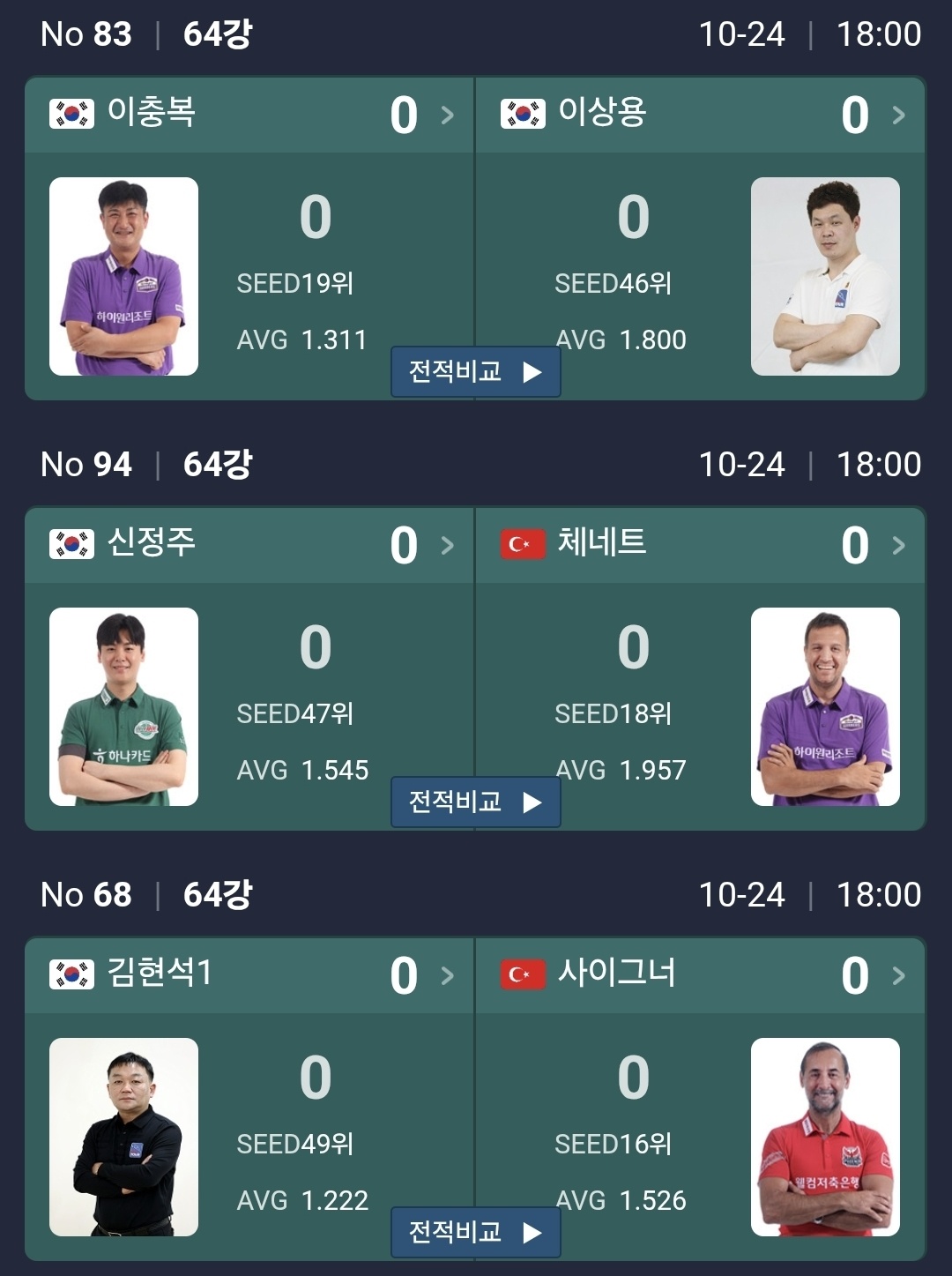 그외 강승용 선수, 김원섭, 이호영 당구선수도 강적들을 이기고 64강에 진출하였습니다. 김원섭은 강민구를 이호영은 하비에르 팔라손(팔라존)을 물리쳤습니다. PBA 챔피언 출신을 잡은 PBA 강호들의 활약이 기대됩니다.
