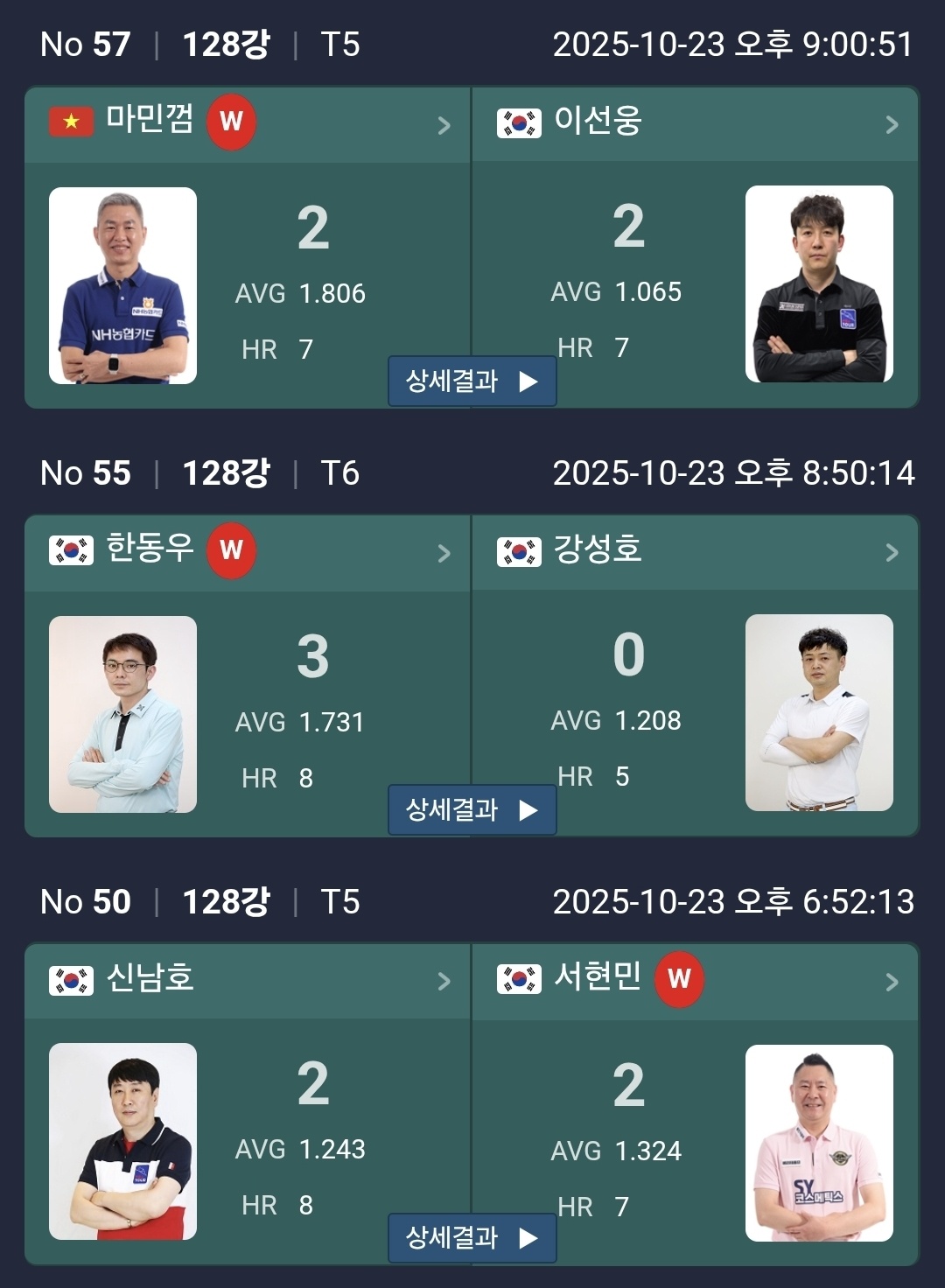 그외 선지훈, 김임권, 김재근, 고상운, 김홍민, 우태하, 이상대, 엉상필 선수도 64강에 진출하여 다음 기회를 노리게 되었습니다.  128강 1일차 경기에서 애버리지 2.0 이상을 기록한 선수는 최성원 선수 한 명 뿐입니다. 최성원 선수 이번대회 결승진출 가능할까요?