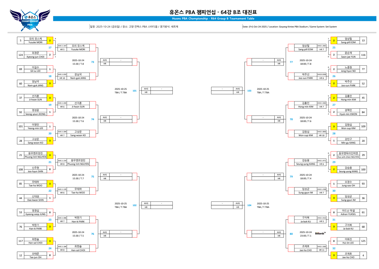 휴온스 PBA 챔피언십 64강 대진표 최종 자료는 128강 2일차 경기결과까지 나와야 확정 배포되는 점에 유의 바랍니다.
