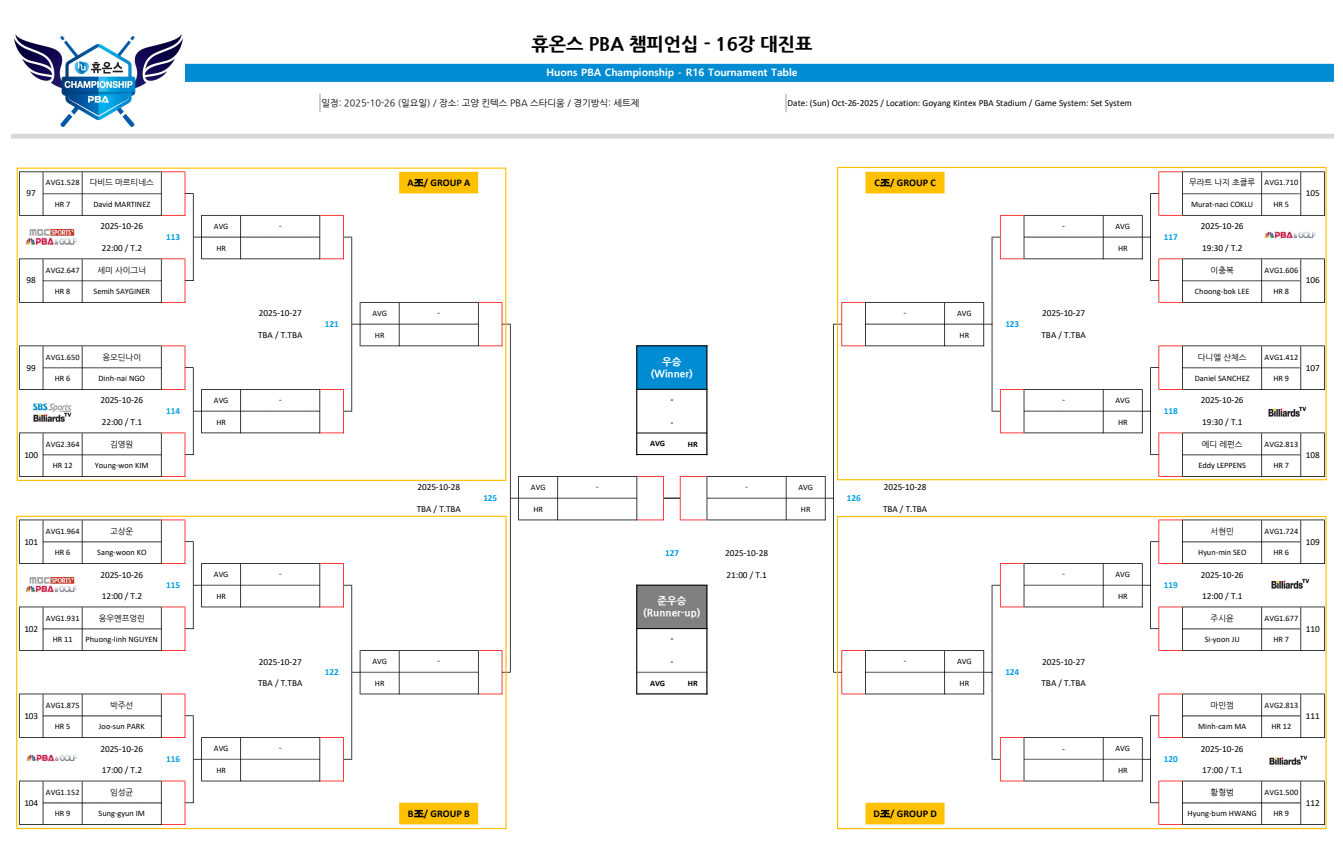 오늘은프로당구 2025-26시즌 6차대회 휴온스 PBA 챔피언십 32강 경기결과와 16강 대진표를 정리하였습니다.
