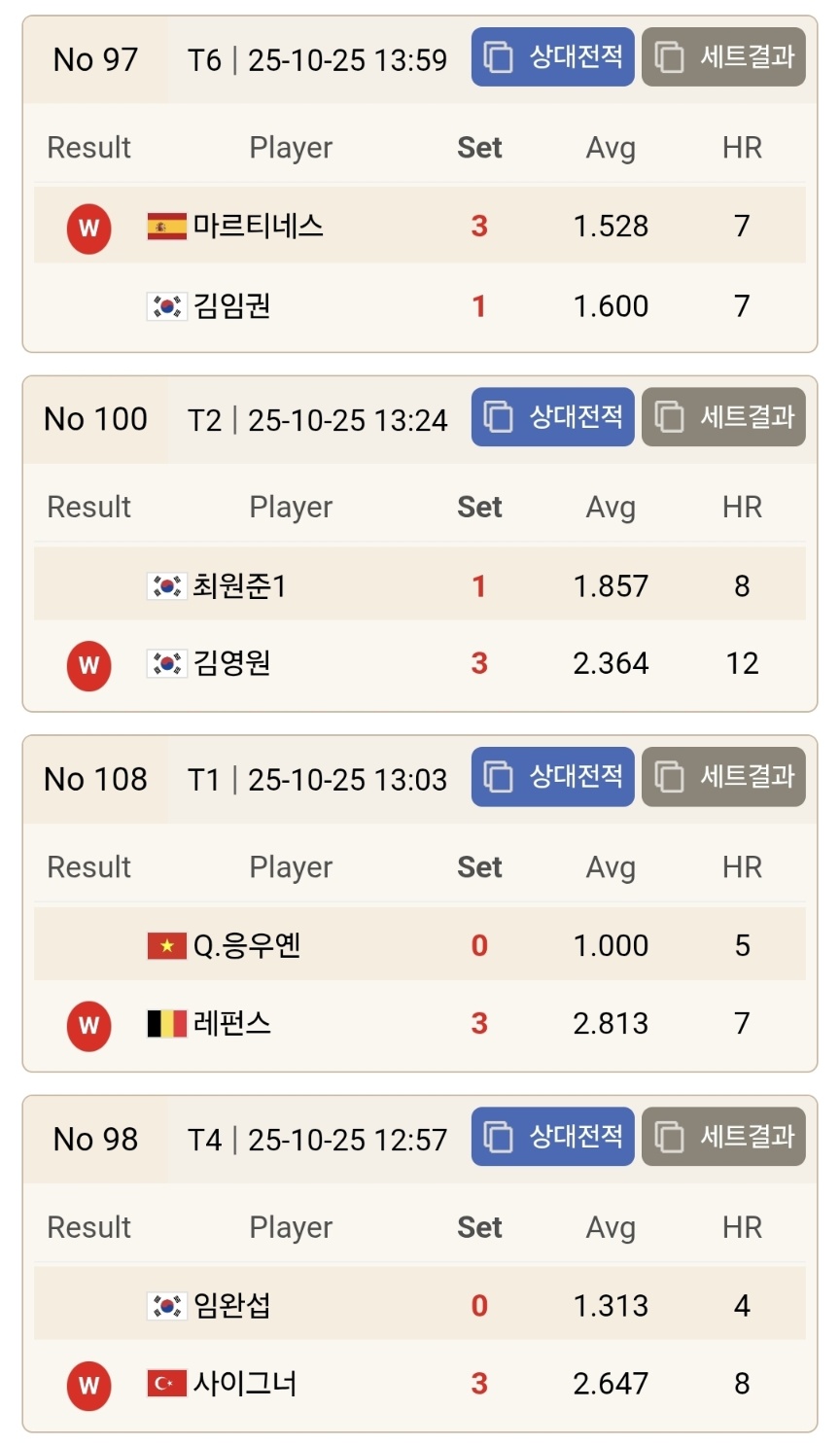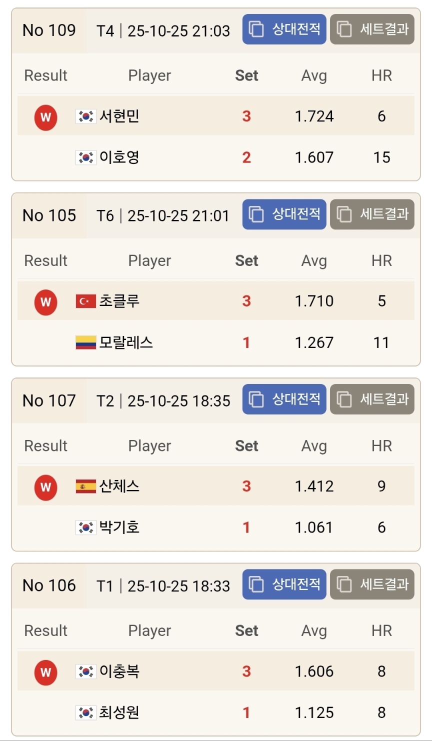 | 휴온스 LPBA 챔피언십 8강 대진표 - 황민지 vs 스롱, 박정현 vs 김상아 (0) | 2025.10.24 |
