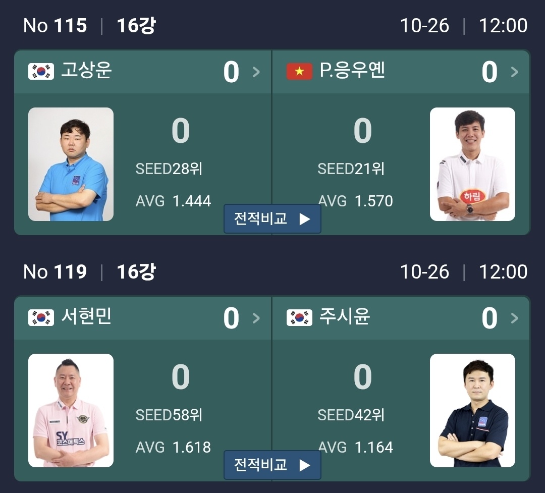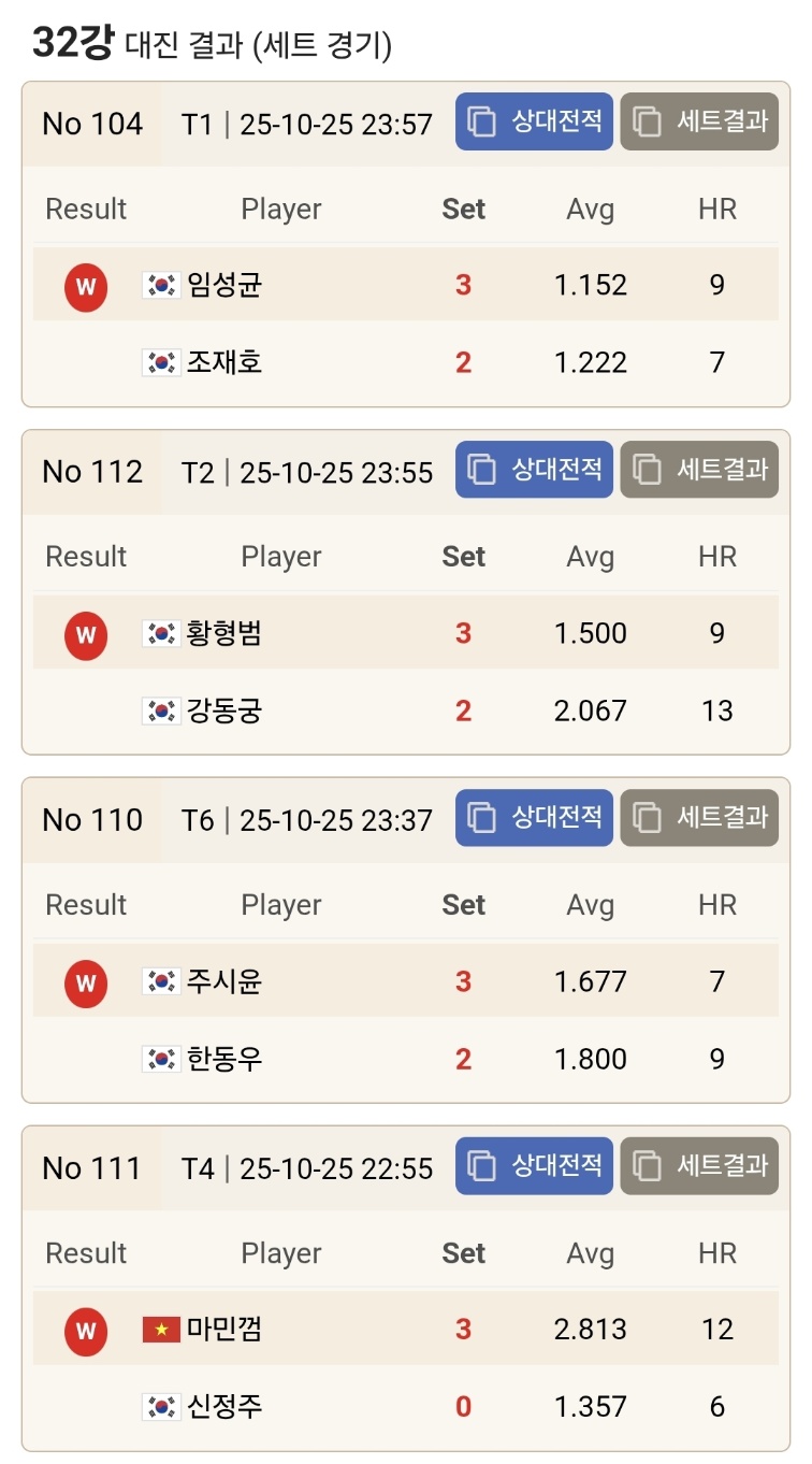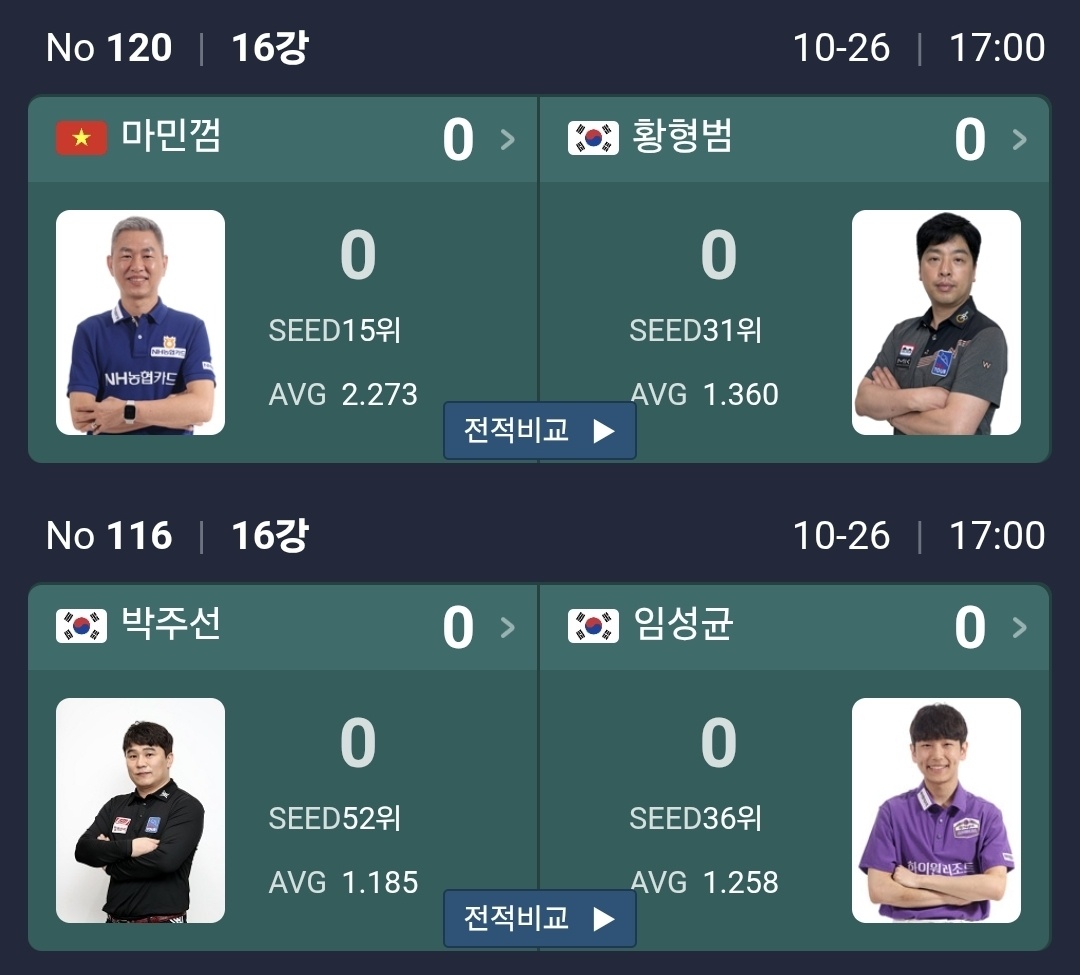 그나저나 조재호, 강동궁, 최성원 선수는 아무도 16강에 진출하지 못했습니다. 이럴 수가...