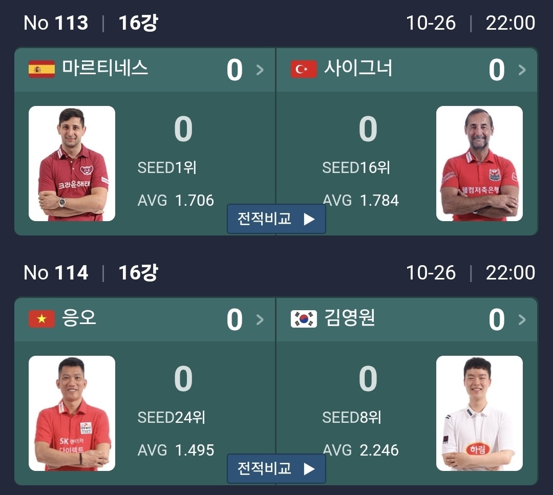 | 휴온스 PBA 챔피언십 8강 대진표 16강 경기결과 (프로당구 25-26) (0) | 2025.10.27 |