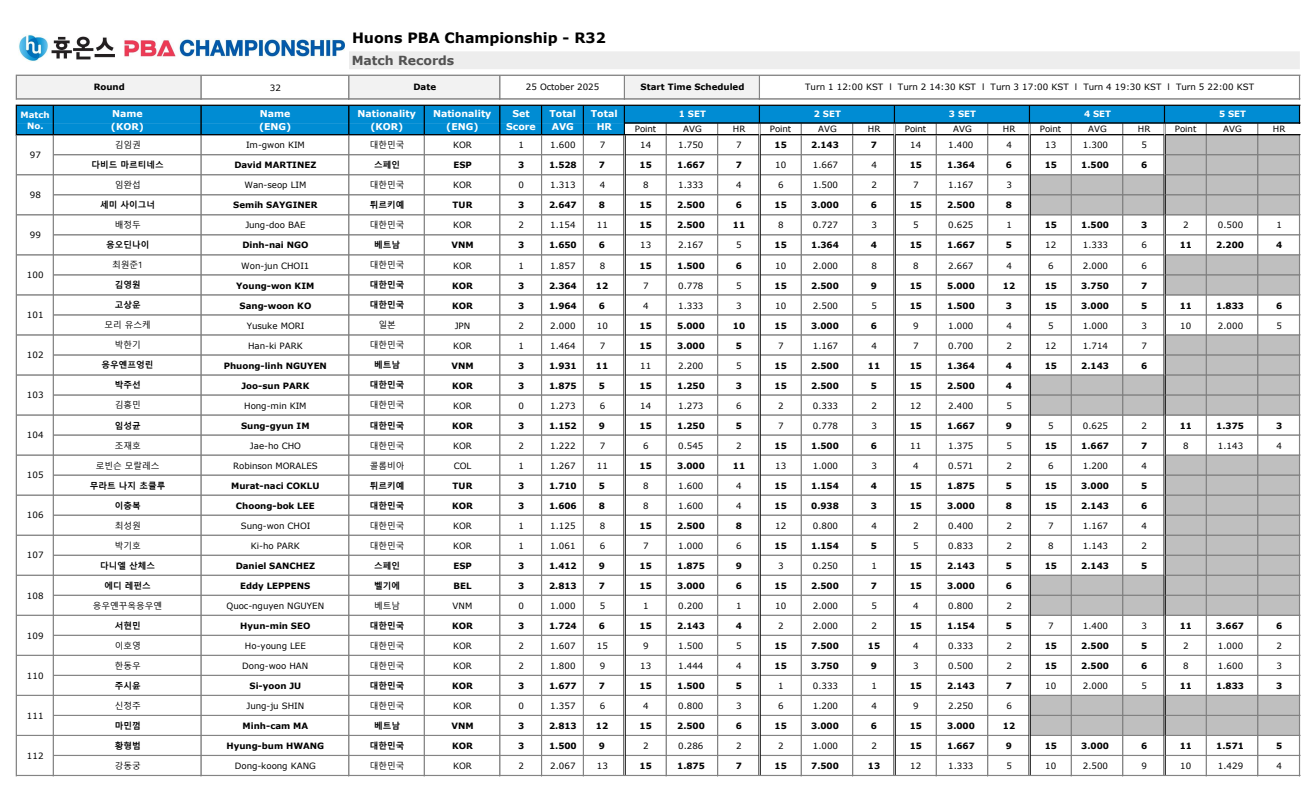 다비드 마르티네스는 강건하게 맨 위에 이름을 올리고 있습니다. 세미 사이그너, 응오딘나이, 김영원, 고상운, 응우옌 프엉린, 박주선, 임성균, 초클루, 이충복, 산체스, 서현민, 주시윤, 마민껌, 황형범이 16강에 진출하였습니다. 16강 진출자 가운데 pba 챔피언 출신은 6명입니다.
