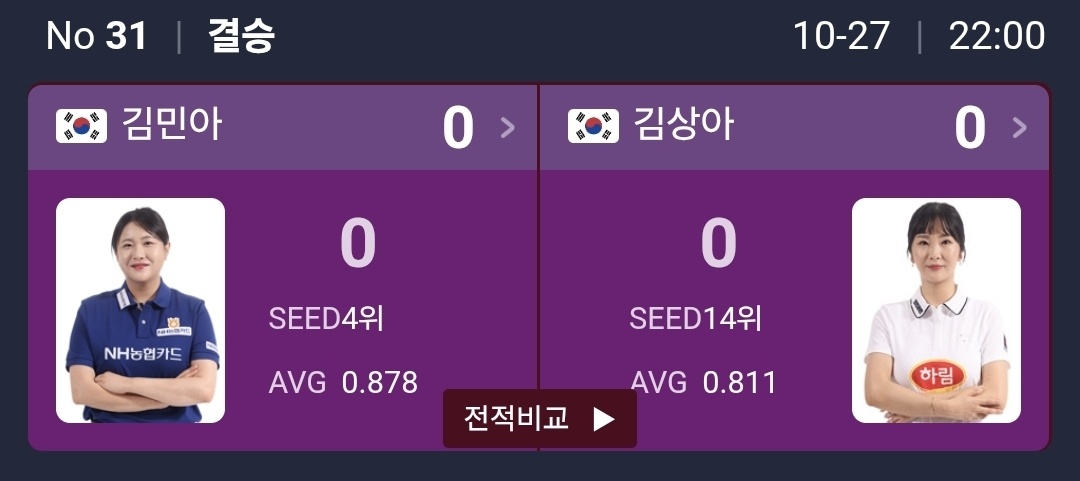 LPBA 우승회수 3회를 기록한 김민아 선수는 2회 우승에 도전하는 김상아 선수를 맞아 4회 우승에 도전하고 있습니다. 객관적 전력은 김민아 선수가 한수 위입니다.