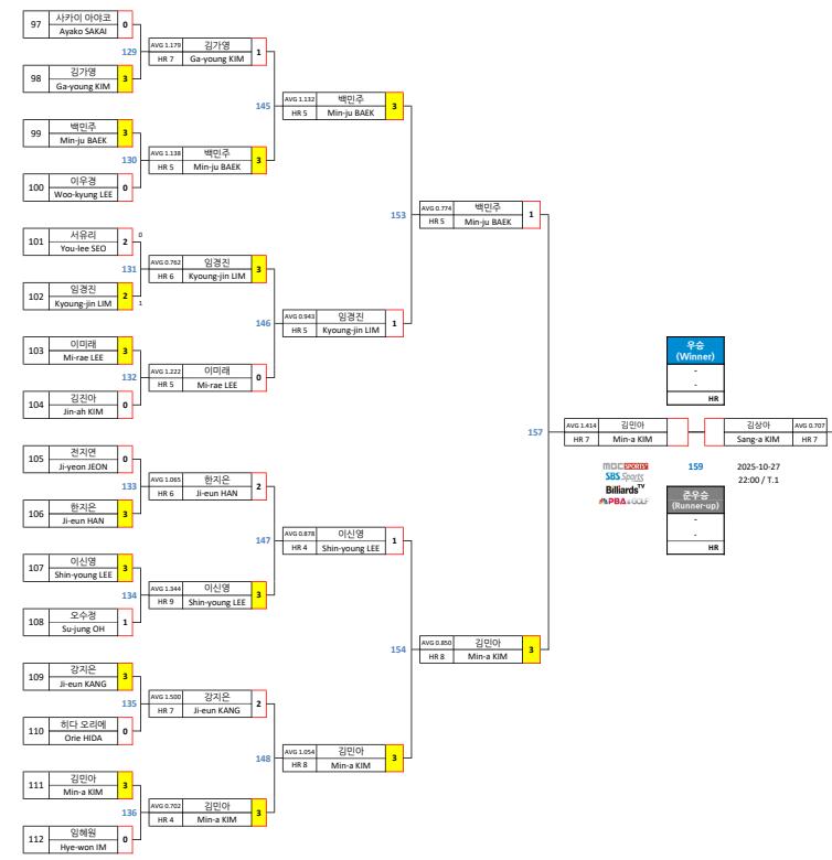 | 휴온스 LPBA 챔피언십 8강 대진표 - 황민지 vs 스롱, 박정현 vs 김상아 (0) | 2025.10.24 |