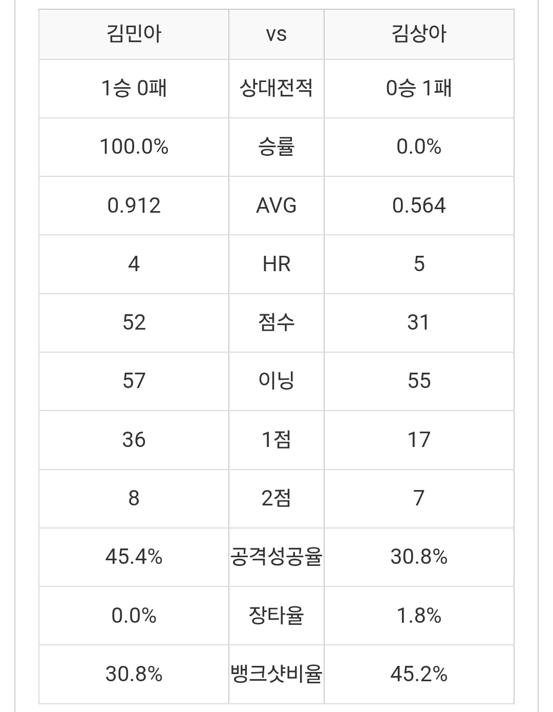 두 선수는 상대전적에서도 김민아가 1승 1패로 앞서 있습니다. 2025년 3월에 펼쳐진 LPBA 월드챔피언십 4강 준결승 경기에서 김민아가 4대 1로 이기고 결승에 진출한 바 있습니다.