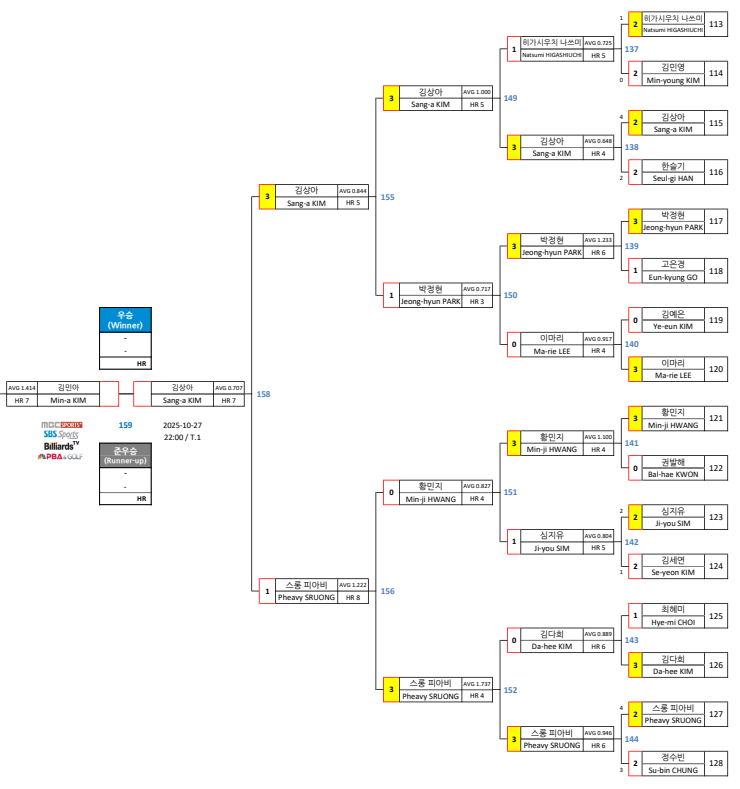| 휴온스 LPBA 챔피언십 8강 대진표 - 황민지 vs 스롱, 박정현 vs 김상아 (0) | 2025.10.24 |