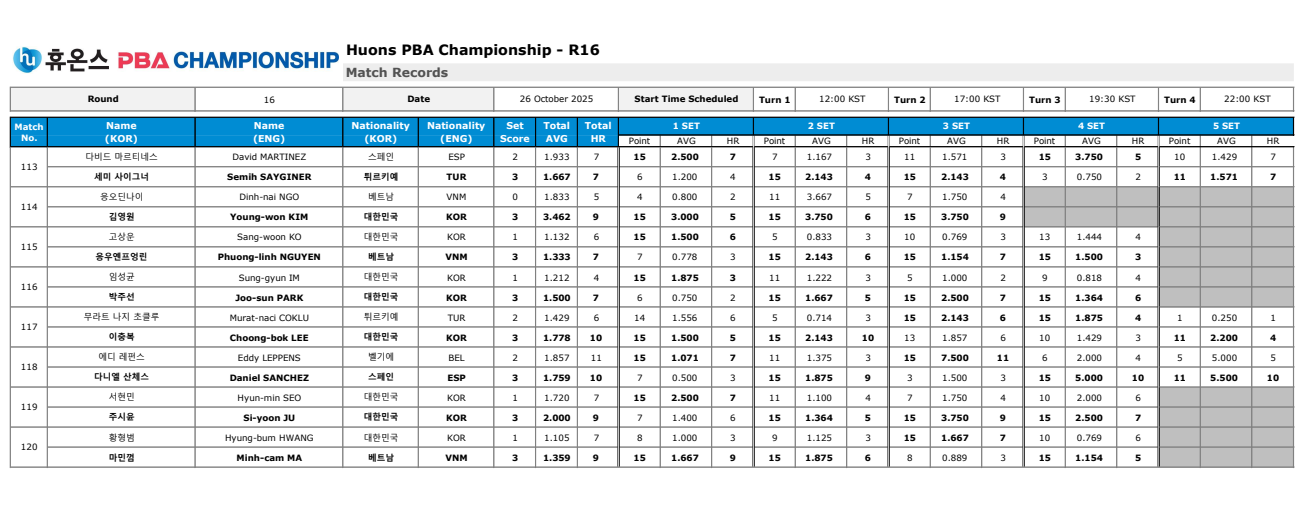 | 휴온스 PBA 챔피언십 16강 대진표 32강 경기결과 (프로당구 25-26) (0) | 2025.10.26 |