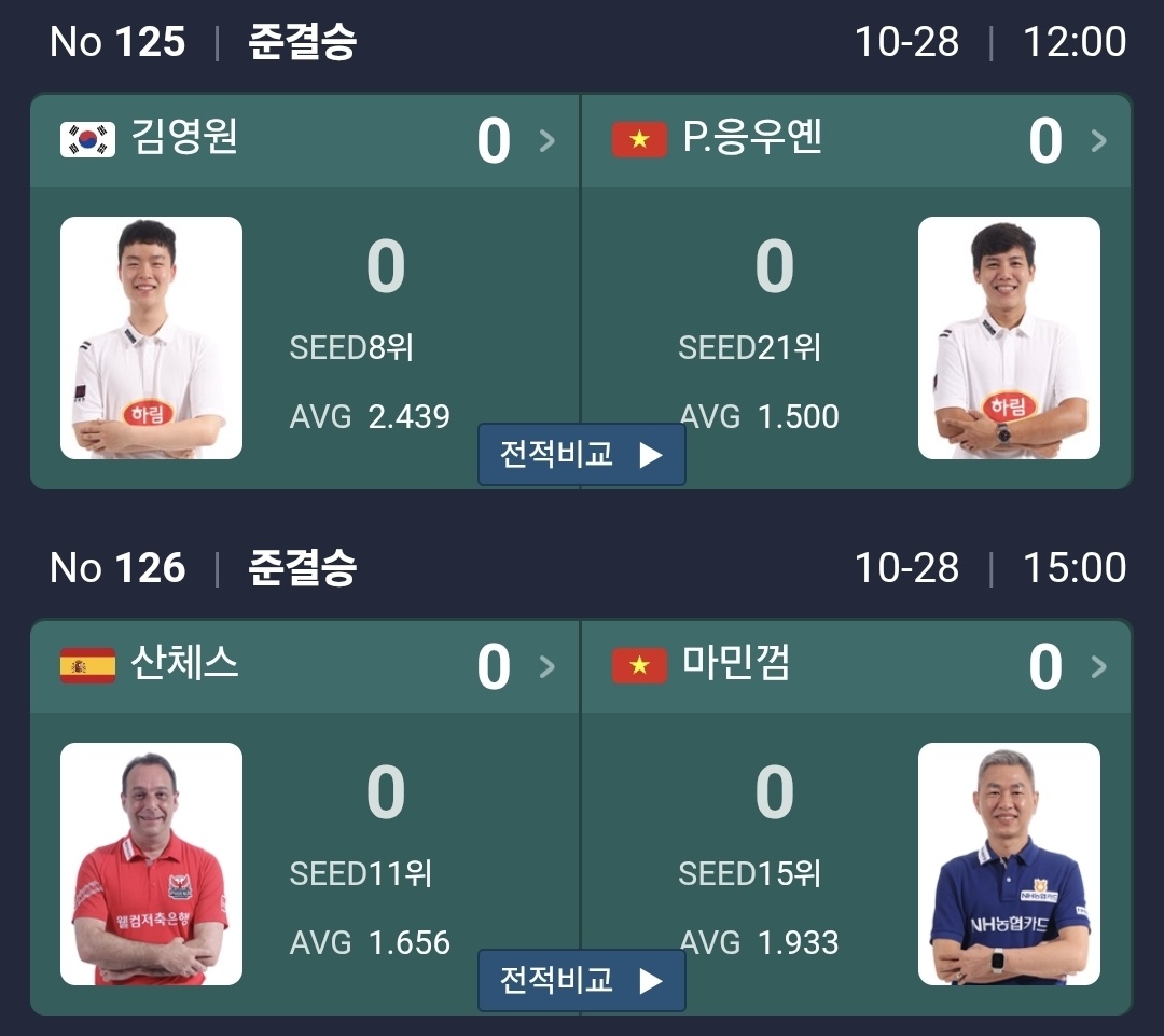 휴온스 PBA 챔피언십 4강 진출자는 한국 1명, 베트남 2명, 스페인 1명으로 압축되었습니다.