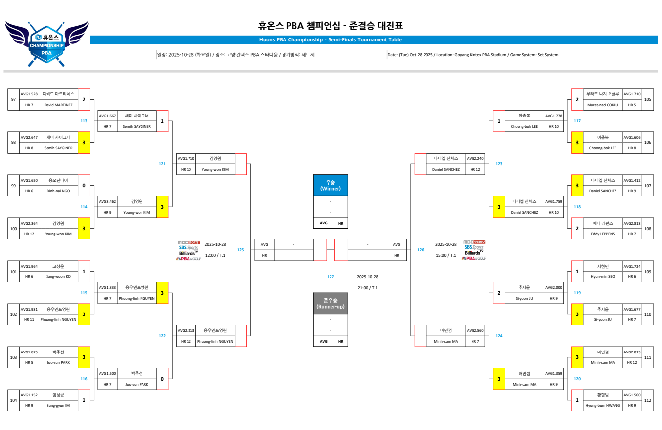 | 휴온스 PBA 챔피언십 결승 대진표 - 김영원 vs 다니엘 산체스 (프로당구 25-26) (0) | 2025.10.28 |