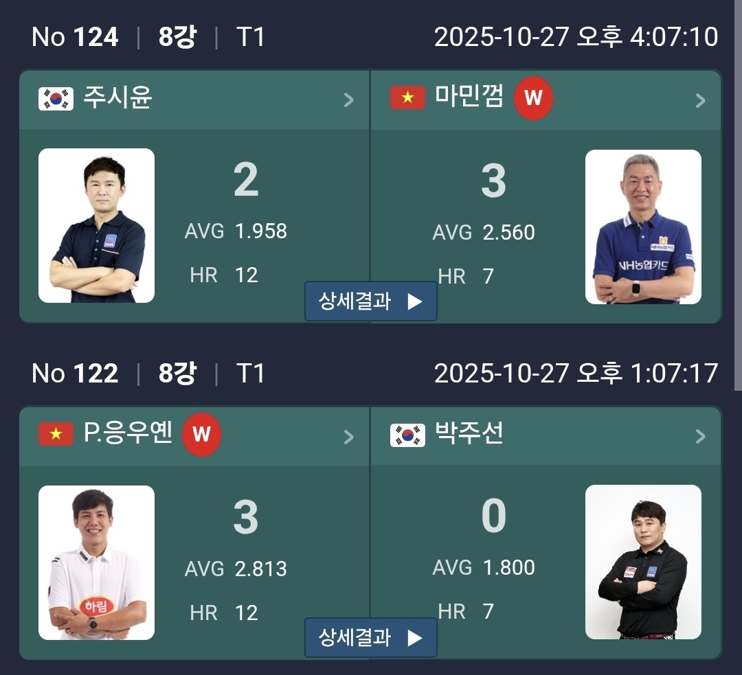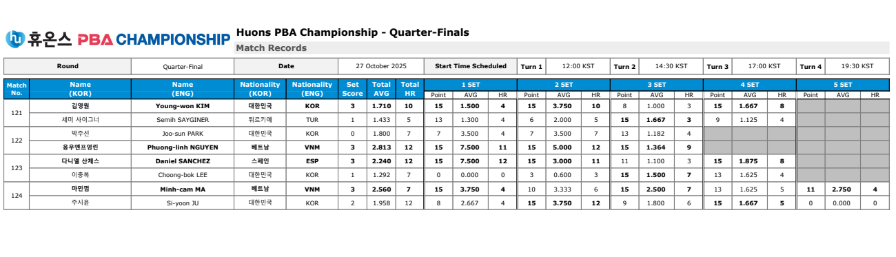 휴온스 PBA 챔피언십 4강 진출자는 한국 1명, 베트남 2명, 스페인 1명으로 압축되었습니다.