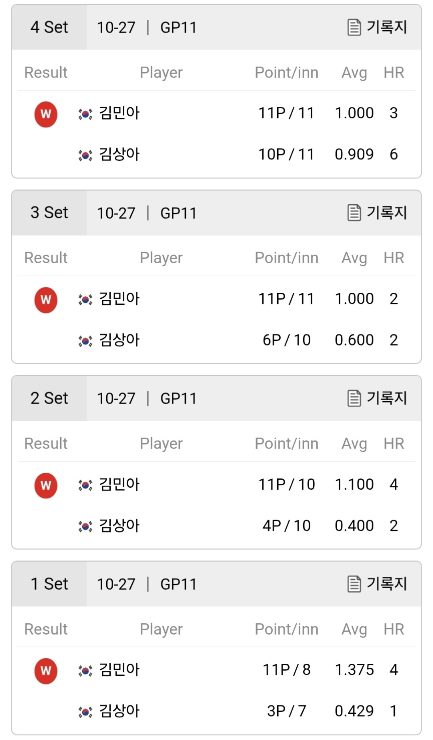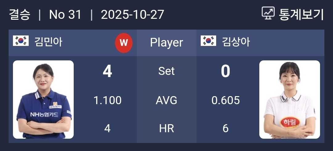 4강 준결승전에서 스롱 피아비를 잡아 낸 김상아 선수의 늪당구를 기대했으나 김민아 선수에게는 전혀 통하지 않았습니다. LPBA 챔피업십 경기 치고는 너무 맥없이 너무진 경기라서 아쉽게 느껴졌습니다.