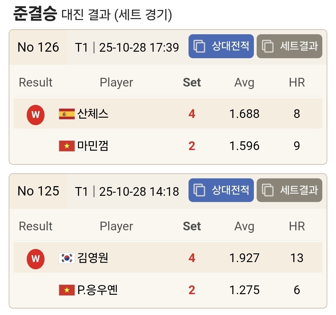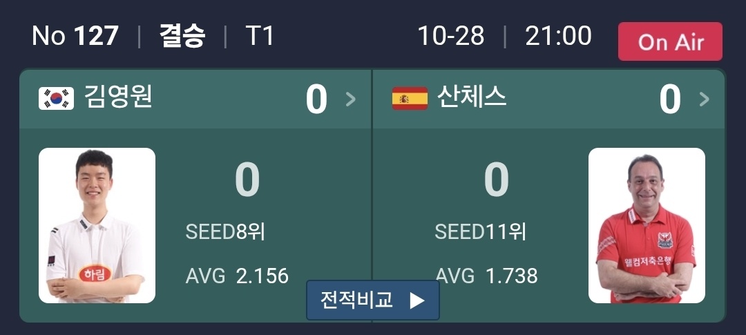 김영원 선수는 2000년대 출생의 신세대 당구 스타로, 뛰어난 두께 감각과 빠른 득점 템포를 자랑합니다. 반면 산체스 선수는 1970년대 출생으로, 오랜 경험과 전통적인 스트로크 감각으로 ‘당구 4대 천왕’ 중 한 명으로 불립니다. 이번 대결은 젊은 피의 패기와 장인의 노련미가 맞붙는 상징적인 결승전이라 할 수 있습니다.