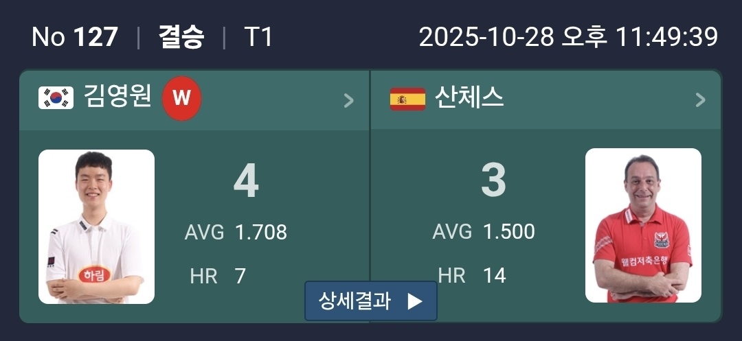 | 휴온스 PBA 챔피언십 결승 대진표 - 김영원 vs 다니엘 산체스 (프로당구 25-26) (0) | 2025.10.28 |