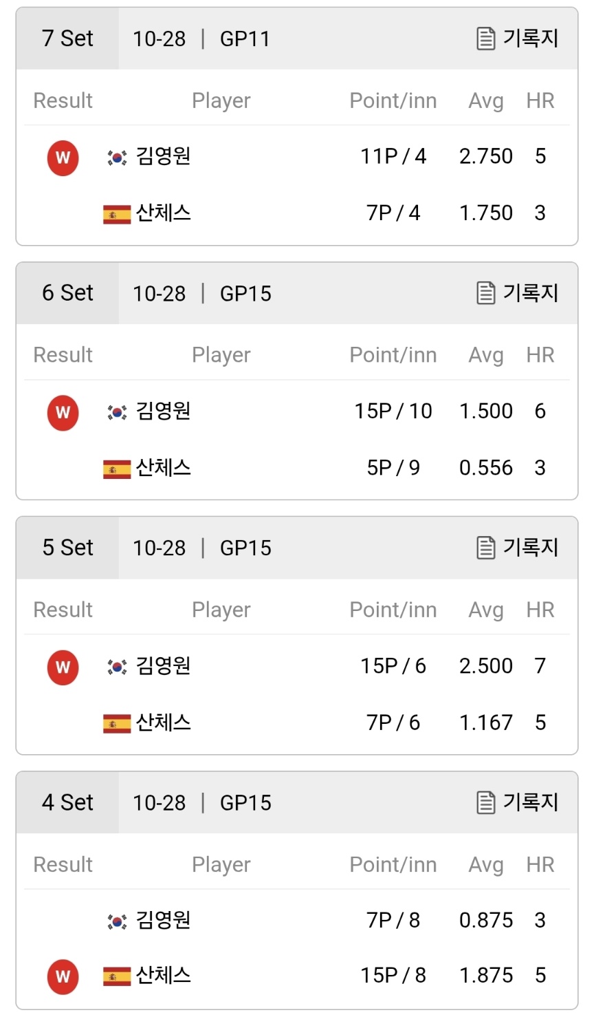 김영원 선수는 중반 이후 두께 선택을 간결하게 가져가며 짧은 이닝 마무리를 이어갔습니다. 5세트에서 하이런 7점을 터뜨리며 흐름을 바꿨고, 6세트에서는 일찌감치 점수 차를 벌려 승부를 원점으로 만들었습니다. 마지막 7세트(GP11)에서도 빠른 템포로 득점을 쌓아 단 4이닝 만에 경기를 끝냈습니다.