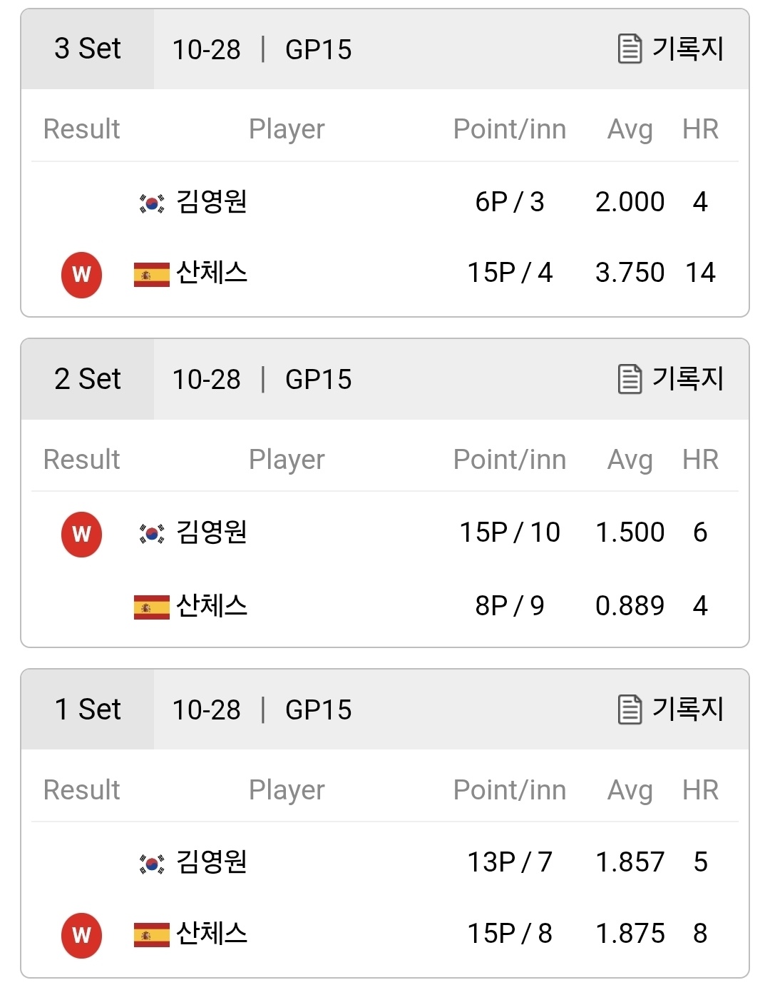 김영원 선수는 중반 이후 두께 선택을 간결하게 가져가며 짧은 이닝 마무리를 이어갔습니다. 5세트에서 하이런 7점을 터뜨리며 흐름을 바꿨고, 6세트에서는 일찌감치 점수 차를 벌려 승부를 원점으로 만들었습니다. 마지막 7세트(GP11)에서도 빠른 템포로 득점을 쌓아 단 4이닝 만에 경기를 끝냈습니다.
