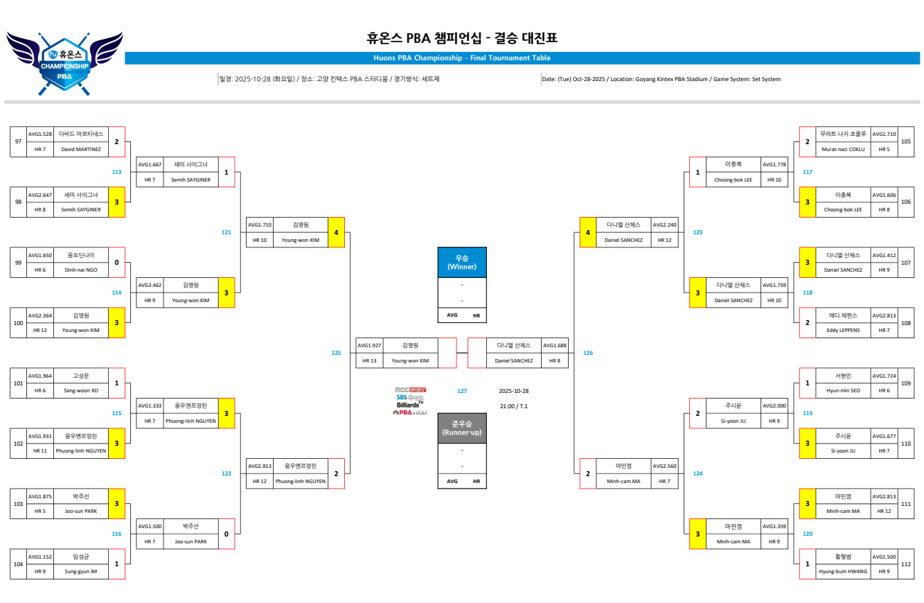 | 휴온스 PBA 챔피언십 결승 대진표 - 김영원 vs 다니엘 산체스 (프로당구 25-26) (0) | 2025.10.28 |