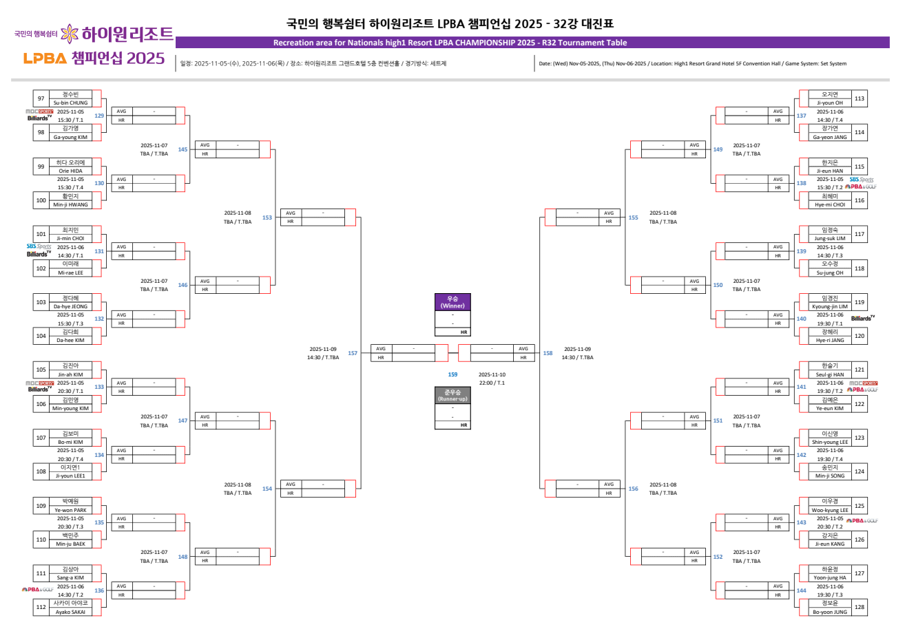 | 하이원리조트 LPBA 챔피언십 2025 - 16강 대진표, 32강 경기 결과, 경기 일정 (0) | 2025.11.06 |