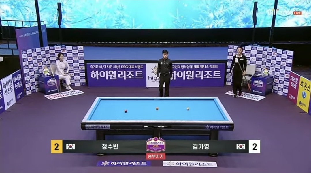 오늘(11월 5일) 열린 하이원리조트 LPBA 챔피언십 2025 32강 경기에서 정수빈(NH농협카드) 당구 선수가 김가영(하나카드)을 세트 스코어 2(승부치기) 대 2로 꺾고 승부치기에서 극적인 승리를 거두며 16강에 진출했습니다.