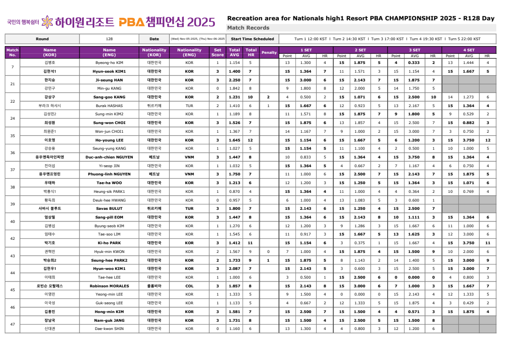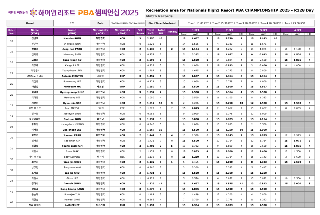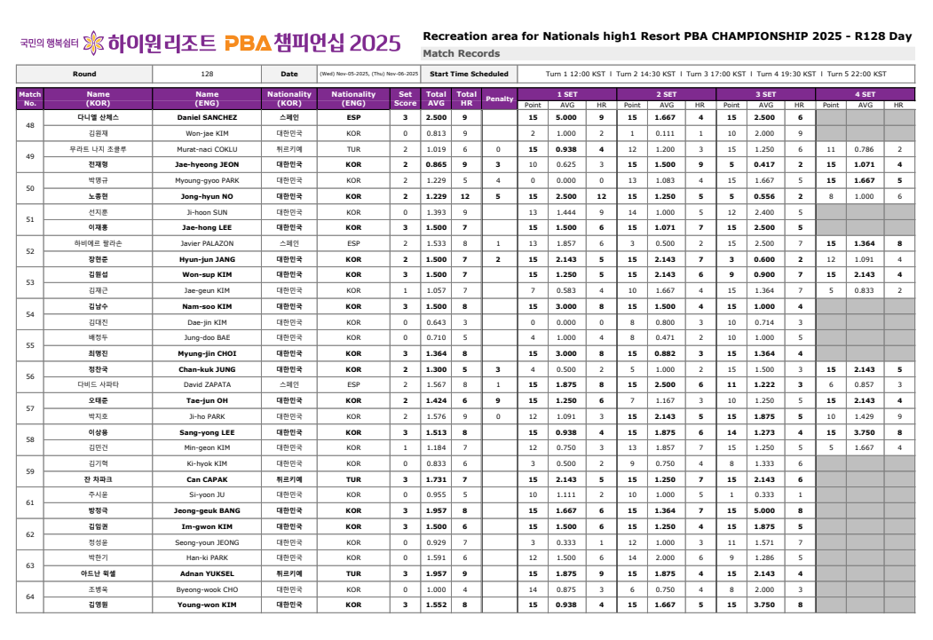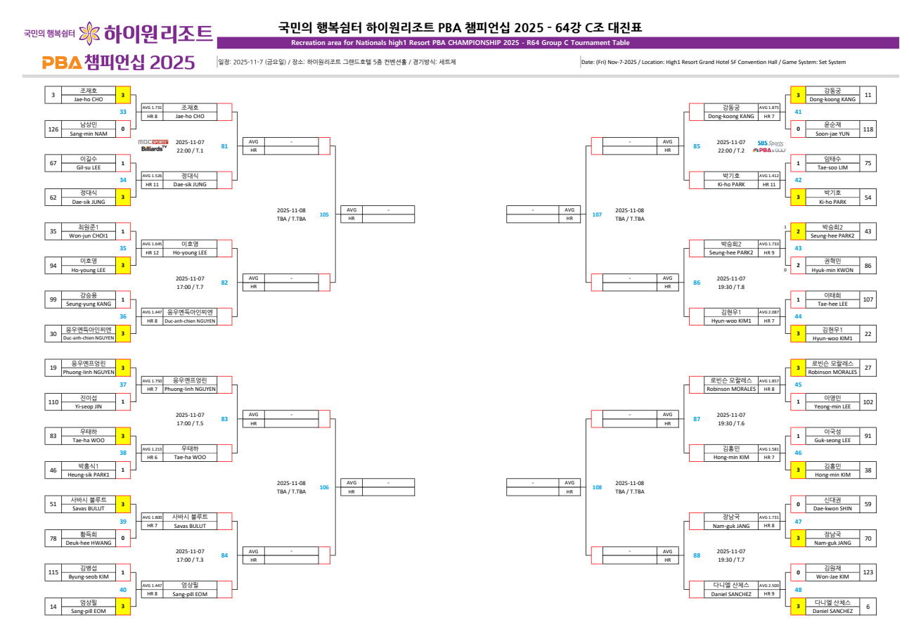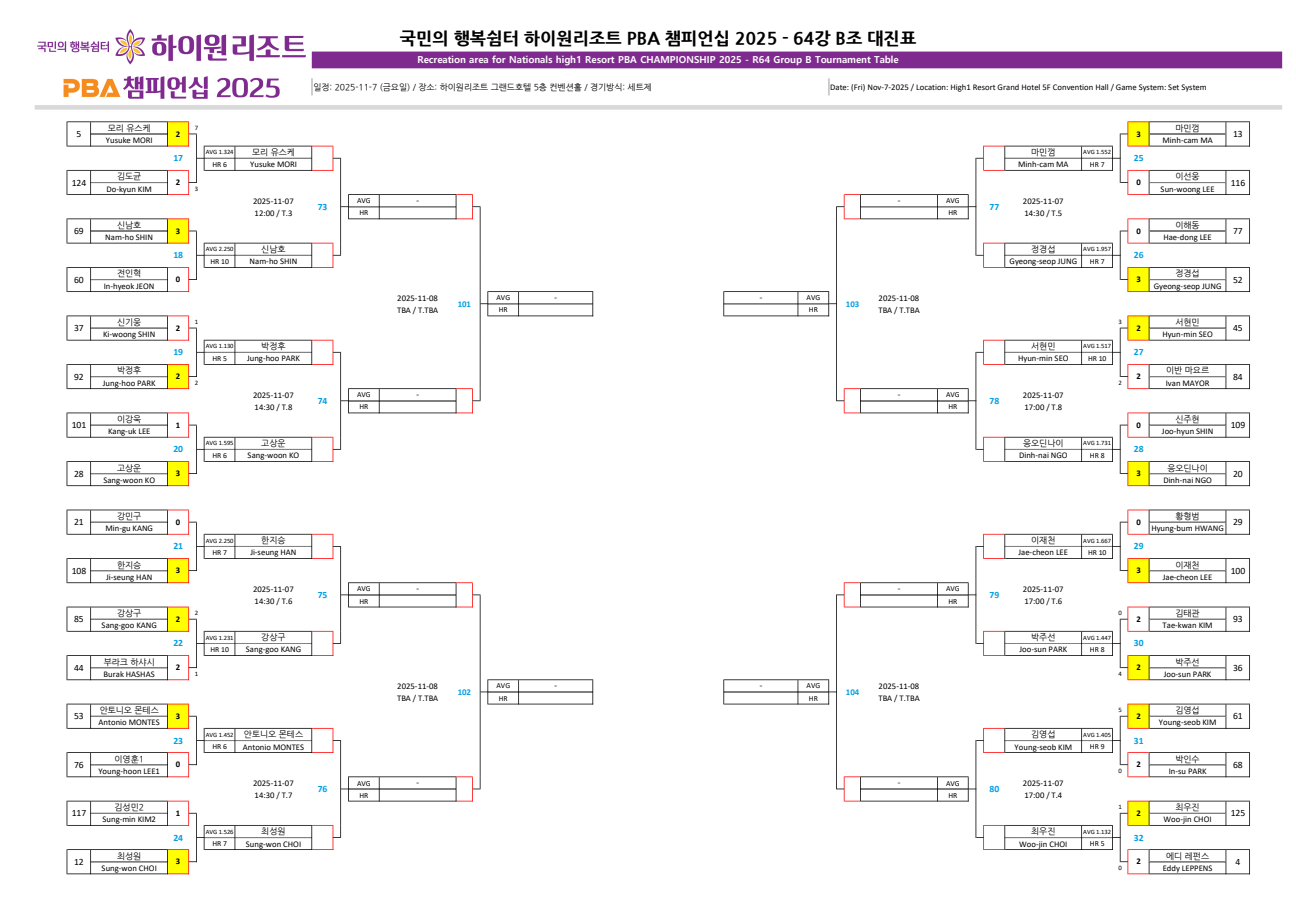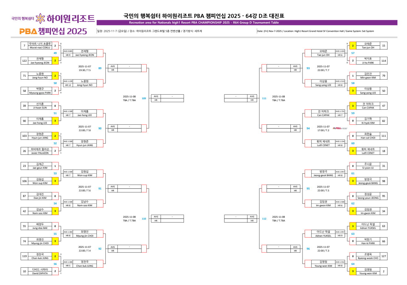| 하이원리조트 PBA 챔피언십 2025 - 32강 대진표와 64강 경기결과 (4) | 2025.11.08 |