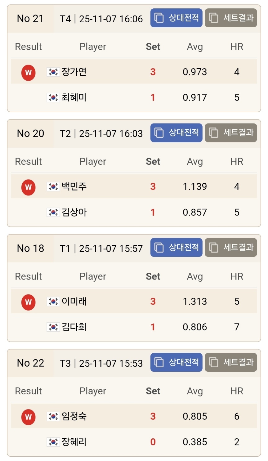 LPBA를 대표하는 강자 이미래 선수는 김다희 선수를 상대로 3-1의 안정적인 승리를 거두며 관록을 보여줬습니다. 비록 한 세트를 내주었지만, 위기 상황에서 평정심을 잃지 않고 경기를 자신의 페이스대로 끌고 가는 능력은 역시 우승 후보 다운 모습이었습니다.