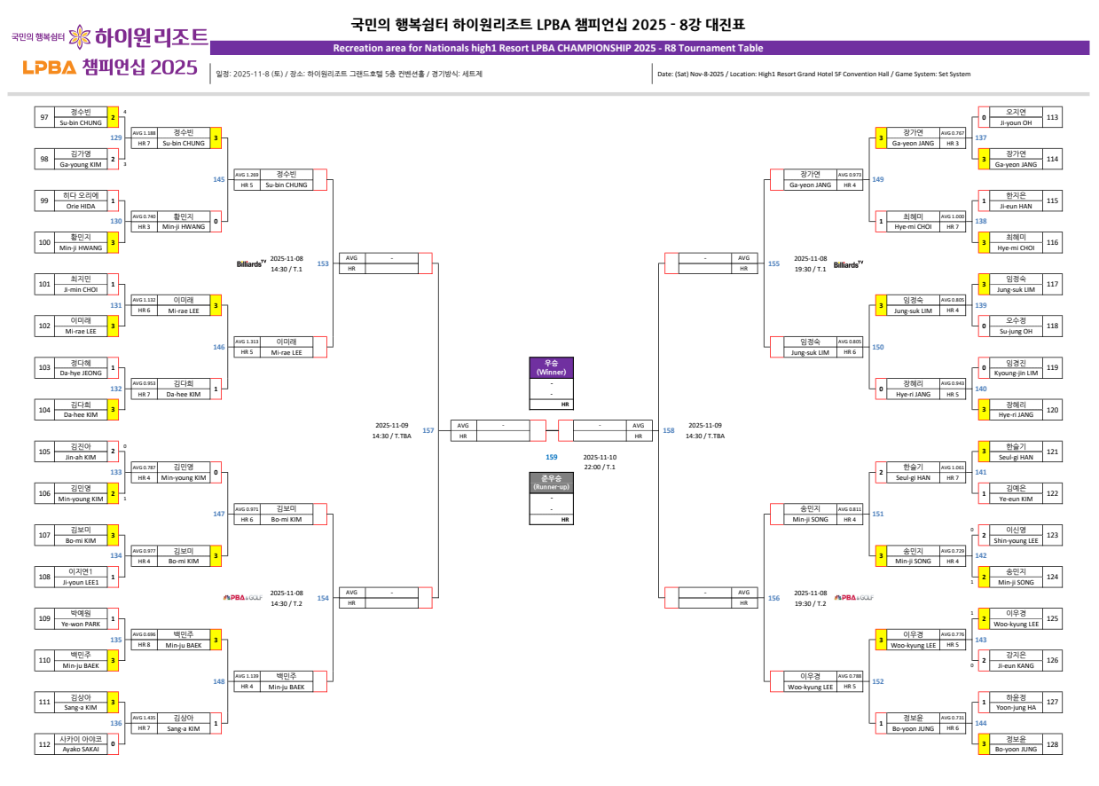| 하이원리조트 LPBA 챔피언십 2025 - 8강 경기결과 4강 대진표 총정리 (0) | 2025.11.08 |