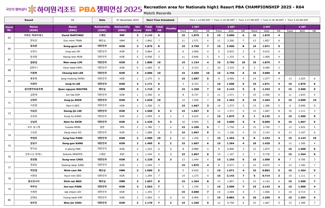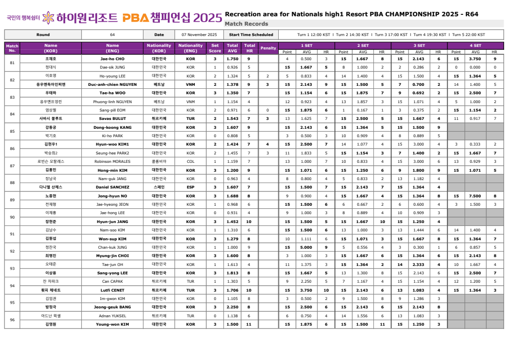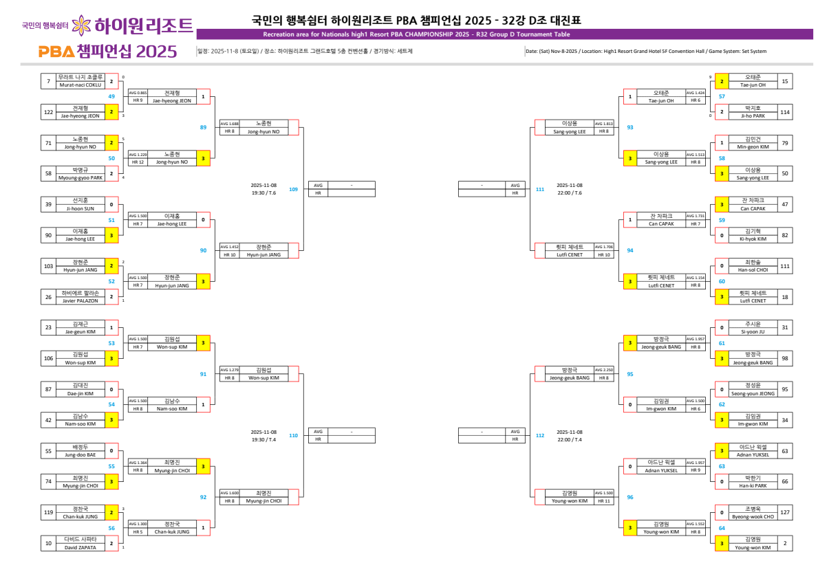 하이원리조트 PBA 챔피언십 2025 - 32강 대진표와 64강 경기결과