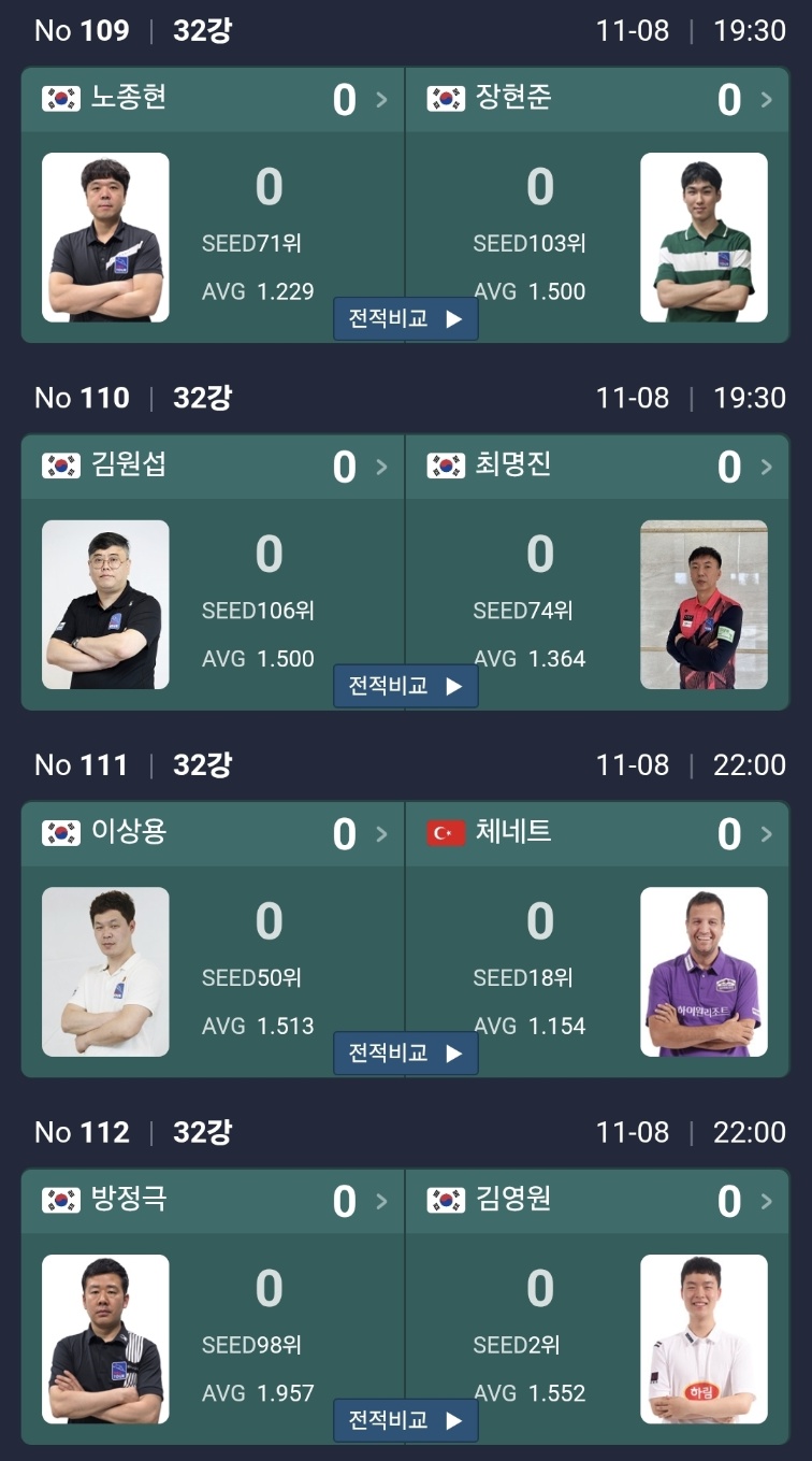 눈길이 필요한 국내 선수들 매치: 이번 대회 최고의 다크호스로 떠오른 노종현과 장현준, 김원섭과 최명진, 박주선과 최우진 선수의 경기도 관심부탁드립니다.