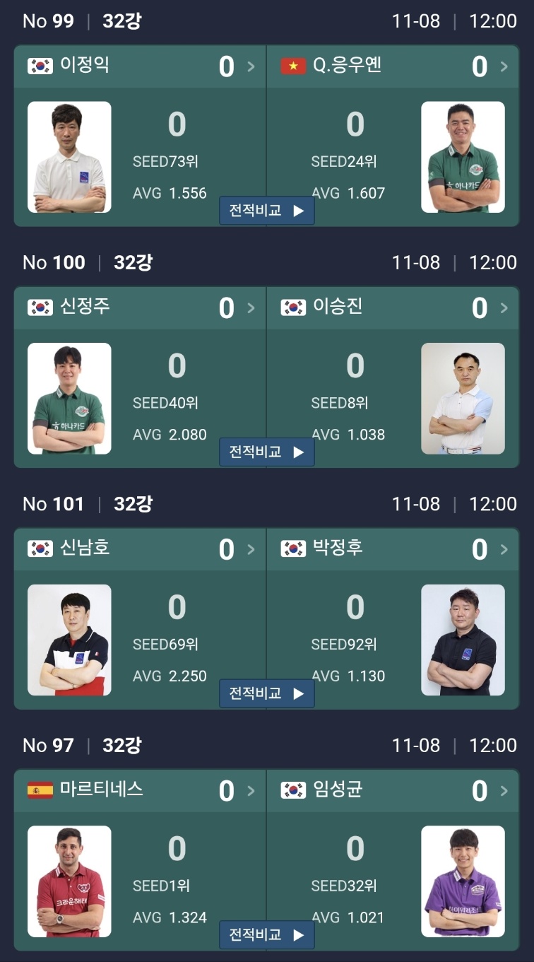 스페인 vs 한국 선수 대결: 압도적인 기량의 다비드 마르티네스는 국내의 강호 임성균을 상대로 대결을 펼치며, 또 다른 스페인의 강자인 다니엘 산체스는 한국의 PBA 신예 김홍민 선수와 경기를 펼칩니다.