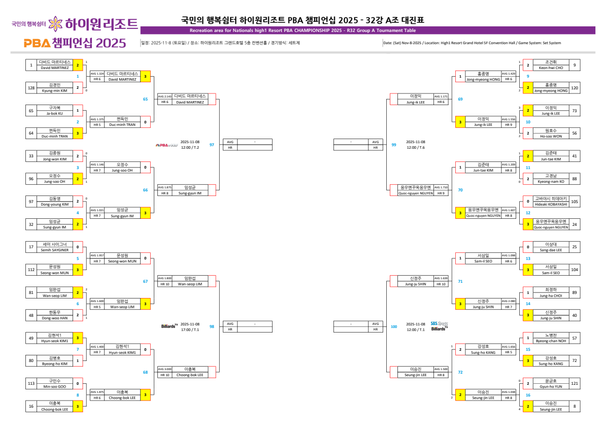 | 하이원리조트 PBA 챔피언십 2025 | 32강 경기결과 & 16강 대진표 (0) | 2025.11.09 |