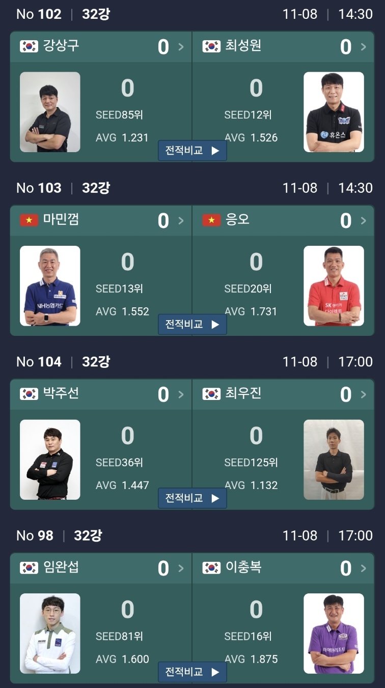 베테랑과 젊은 강자: 베테랑 강상구는 최성원을 상대로 만나 16강 진출을 다투며, 젊은 강자 신정주는 이승진과 만나 예측 불가능한 승부를 펼칠 것으로 예상됩니다.