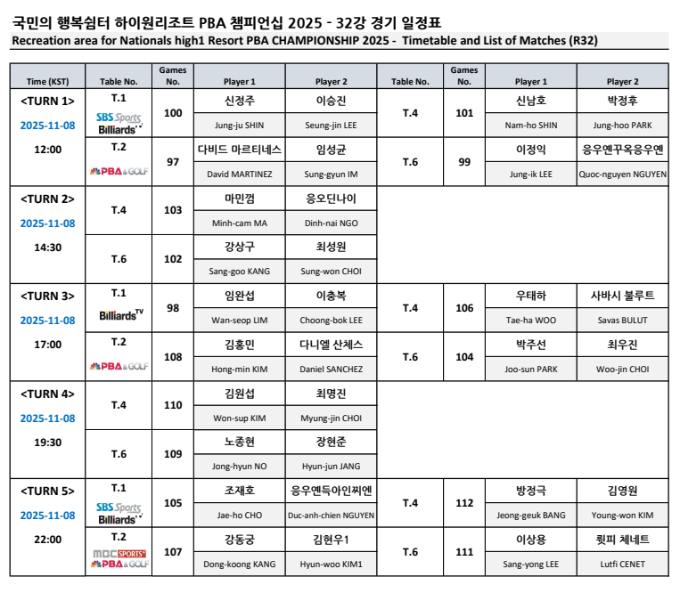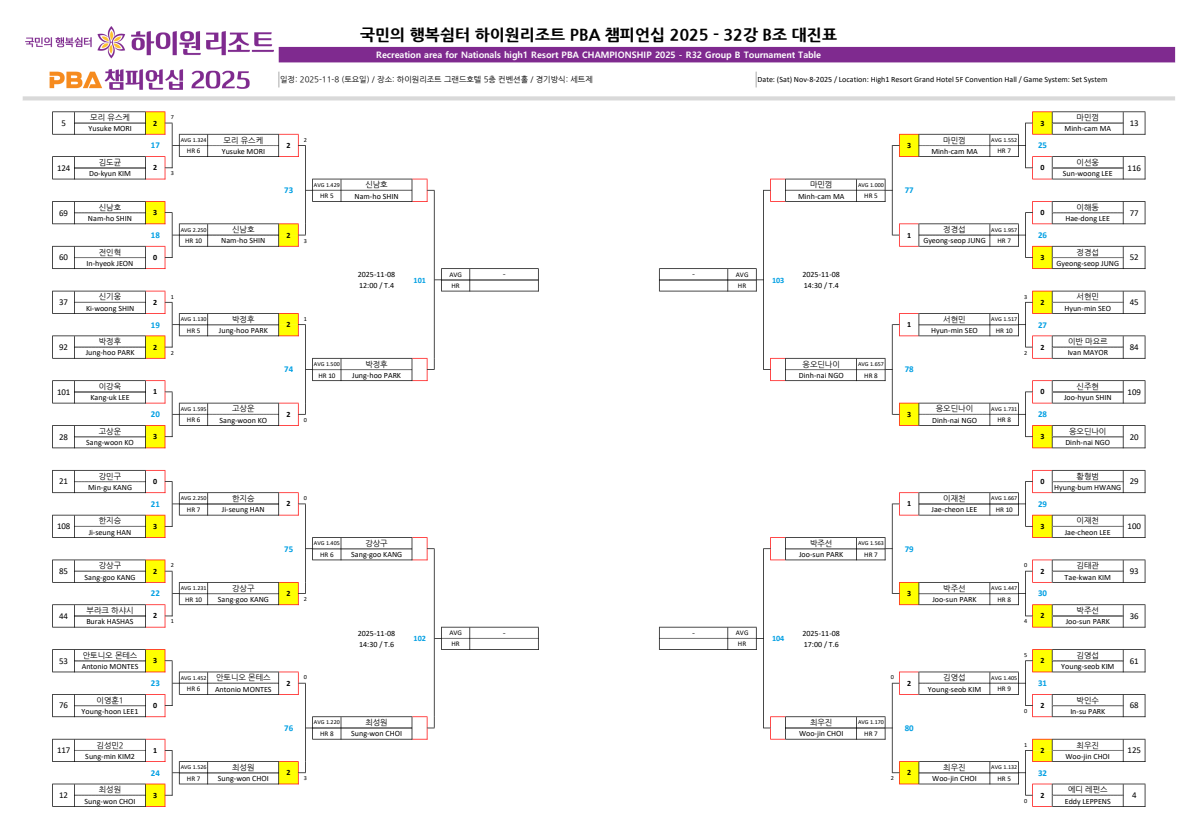 | 하이원리조트 PBA 챔피언십 2025 | 32강 경기결과 & 16강 대진표 (0) | 2025.11.09 |