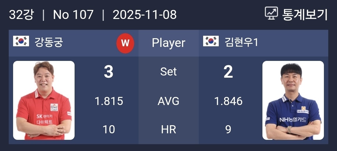 11월 8일 열린 하이원리조트 PBA 챔피언십 2025 32강 경기에서 강동궁이 김현우를 세트스코어 3대 2로 제압하며 16강에 진출했습니다. 경기 내내 팽팽한 공방이 이어졌으며, ‘챔피언의 귀환’을 알리는 강동궁의 집중력과 함께, 김현우의 성장 가능성도 충분히 증명된 명승부였습니다.
