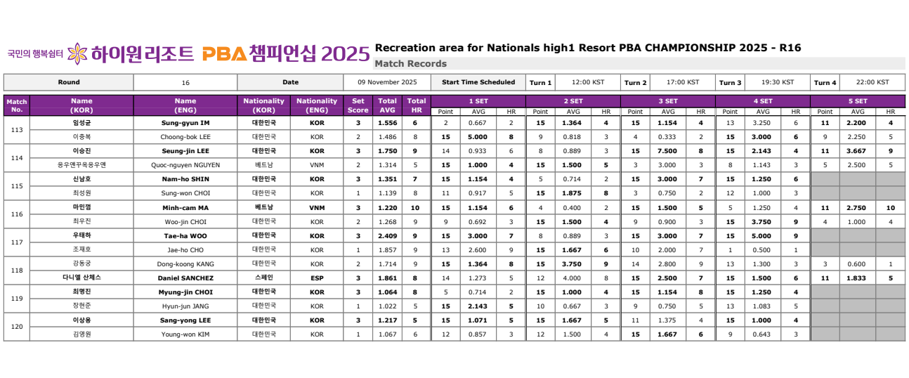 | 하이원리조트 PBA 챔피언십 2025 - 32강 대진표와 64강 경기결과 (1) | 2025.11.08 |