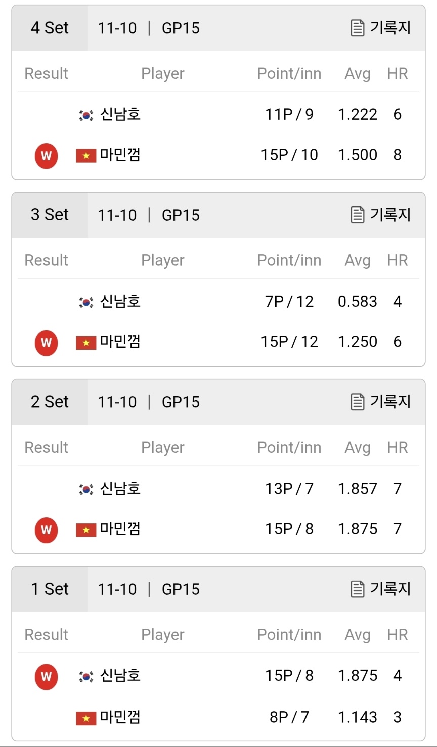 1세트 초반은 신남호의 기세가 거셌습니다. 8이닝 만에 15점을 기록하며 평균 1.875의 고공 득점력을 보였고, 첫 세트를 선취했습니다. 하지만 2세트부터는 마민껌의 반격이 시작됐습니다. 정확한 각도 계산과 뱅크샷 감각으로 15대13으로 세트를 가져가며 흐름을 되찾았고, 3세트에서는 더욱 안정적인 경기운영으로 15대7 완승을 거두며 승부를 뒤집었습니다. 마지막 4세트에서도 집중력을 잃지 않은 마민껌은 15대11로 경기를 마무리, 세트 스코어 3대1로 경기를 끝냈습니다.