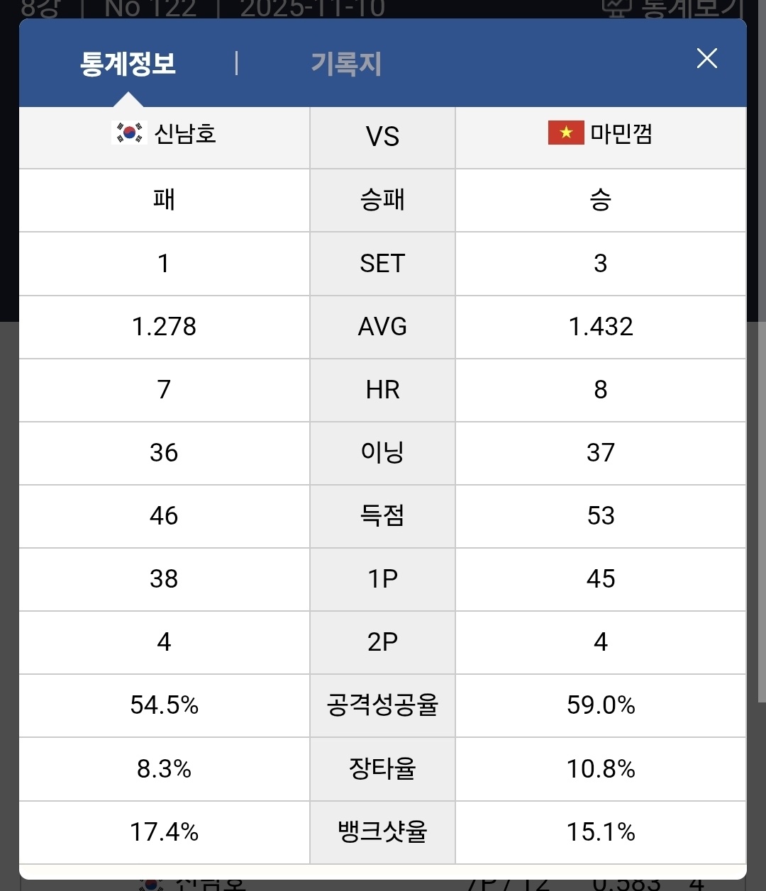 공격성공률은 마민껌이 59.0%, 신남호는 54.5%였으며, 뱅크샷 성공률에서도 마민껌이 15.1%로 근소하게 앞섰습니다. 두 선수의 이닝 수는 각각 37이닝(마민껌)과 36이닝(신남호)으로 거의 차이가 없었지만, 득점 기회 활용 면에서 베트남 선수가 한 수 위였습니다.