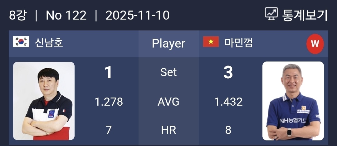 11월 10일 펼쳐진 하이원리조트 PBA 챔피언십 2025 8강전에서 베트남의 마민껌 선수가 신남호를 세트 스코어 3대 1로 꺾고 준결승 진출에 성공했습니다. 참조로 마민껌은 얼마전까지는 마민캄이라고 이름을 표기하였습니다. 아무튼 세트별 스코어는 8강다운 수준 높은 집중력 속에서 치열하게 전개되었으며, 경기 내내 마민껌 특유의 정교한 타격과 안정된 수비 운영이 돋보였습니다.
