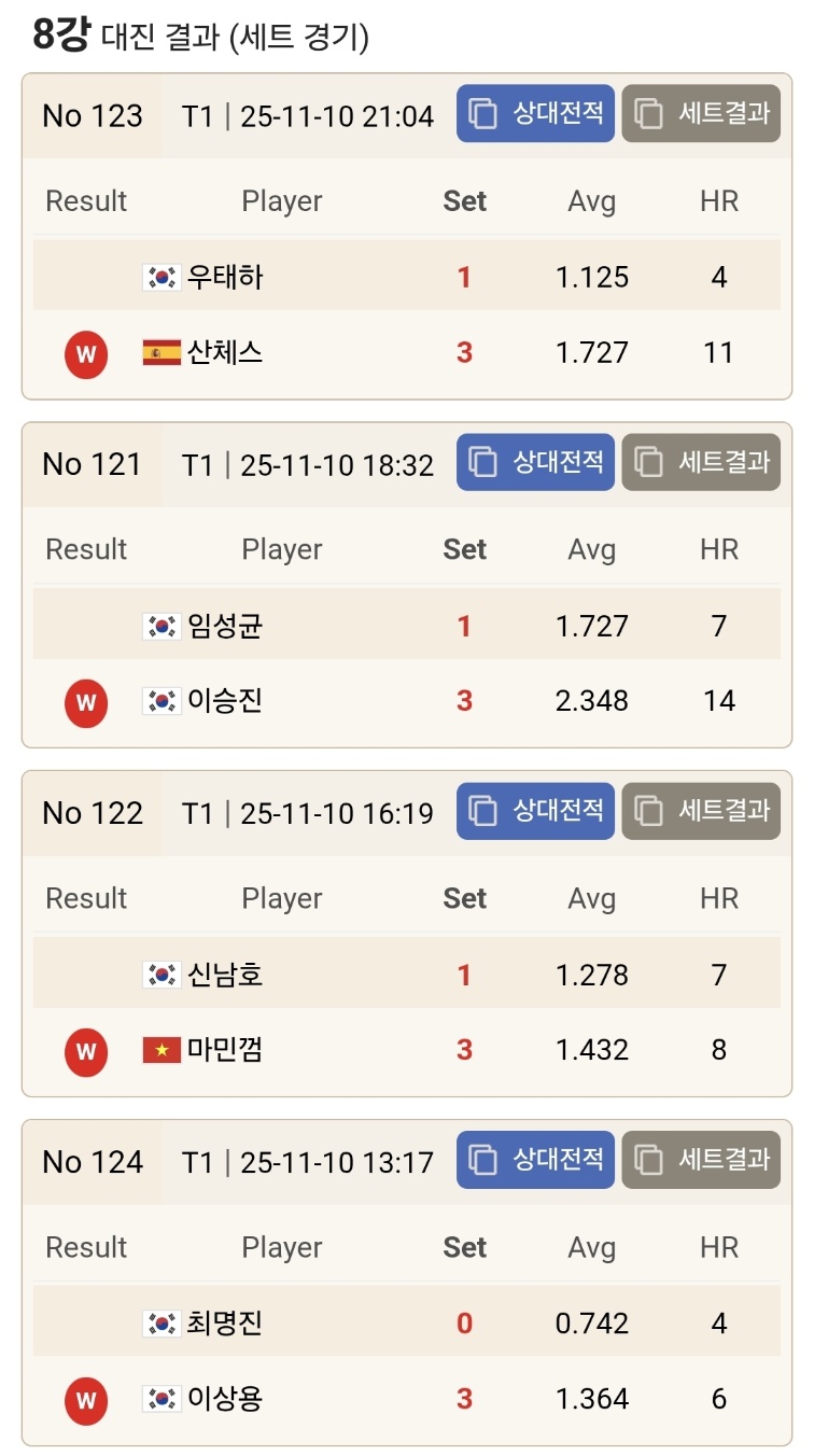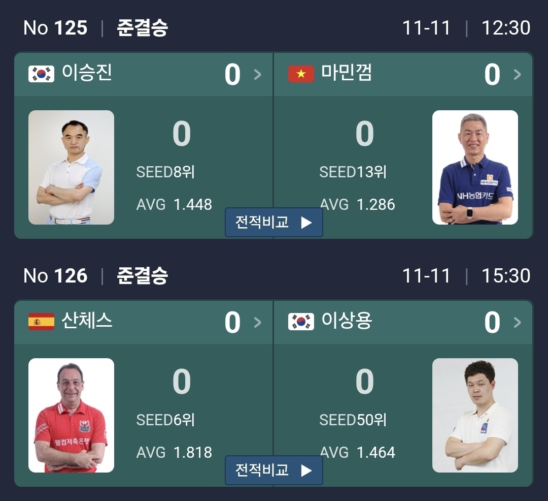 이번 4강에는 우승 경험자 세 명과 신흥 강자 한 명이 포진했습니다. 산체스·마민껌·이승진은 모두 두 번째 우승을 노리는 재등극 레이스에 돌입했고, 이상용은 빼어난 세트 운영과 집중력을 앞세워 첫 우승의 문턱을 두드립니다. 에버리지의 등락이 큰 토너먼트 특성상, 시작과 동시에 터지는 초반 장타 한두 번이 경기 구조 전체를 바꿔놓을 가능성도 큽니다.