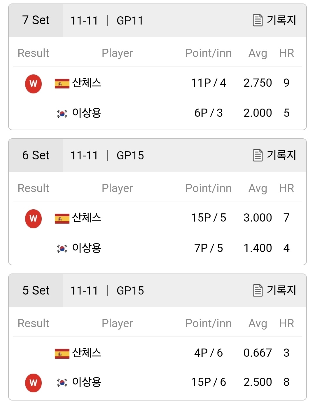 경기 초반 1세트는 산체스가 11이닝 동안 15점을 적중시키며 기선 제압에 성공했습니다. 하지만 이상용이 곧바로 반격에 나서 2세트와 3세트를 연달아 가져가며 2대 1로 앞서갔습니다. 5세트까지 두 선수는 서로 한 세트씩 주고받으며 3대 2로 이상용이 앞서갔지만, 6세트에서 산체스가 단 5이닝 만에 15점을 완성하며 분위기를 뒤집었습니다.