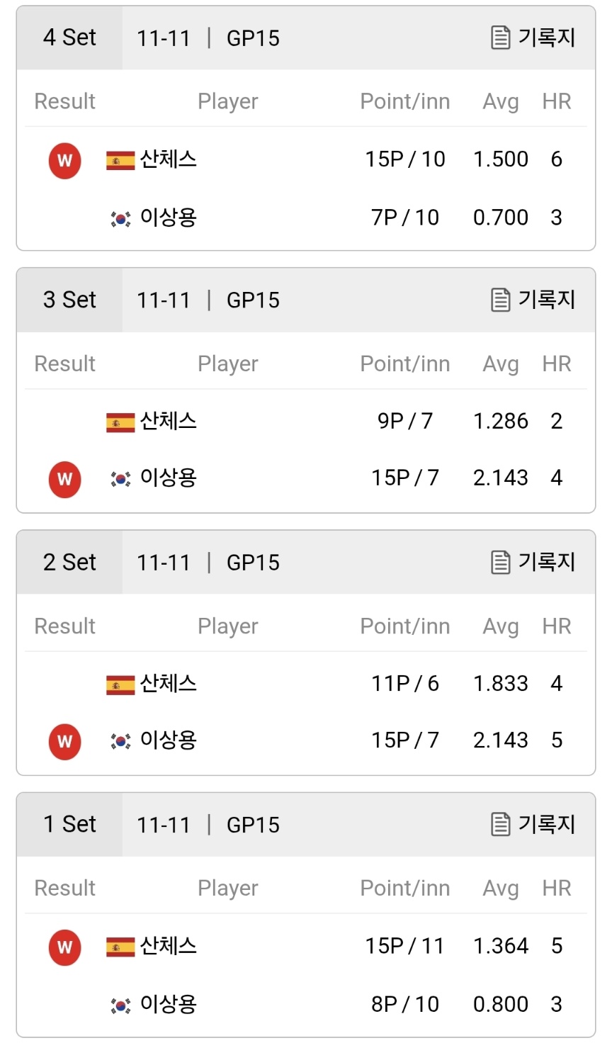 경기 초반 1세트는 산체스가 11이닝 동안 15점을 적중시키며 기선 제압에 성공했습니다. 하지만 이상용이 곧바로 반격에 나서 2세트와 3세트를 연달아 가져가며 2대 1로 앞서갔습니다. 5세트까지 두 선수는 서로 한 세트씩 주고받으며 3대 2로 이상용이 앞서갔지만, 6세트에서 산체스가 단 5이닝 만에 15점을 완성하며 분위기를 뒤집었습니다.