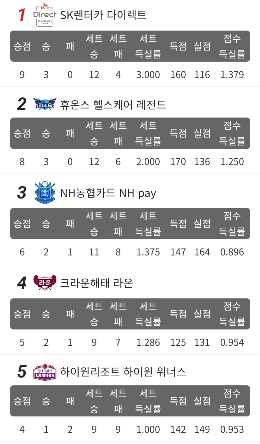 상위권에서는 SK렌터카 뒤를 이어 휴온스, NH농협카드, 크라운해태, 하이원리조트가 촘촘하게 붙어 있으며 그 아래로 에스와이, 하나카드, 우리금융캐피탈, 하림, 웰컴저축은행이 자리하고 있습니다. 하루 만에 순위가 바뀔 정도로 승차가 촘촘한 상황이라 남은 4라운드에서도 더욱 예측 불가의 흐름이 이어질 전망입니다.