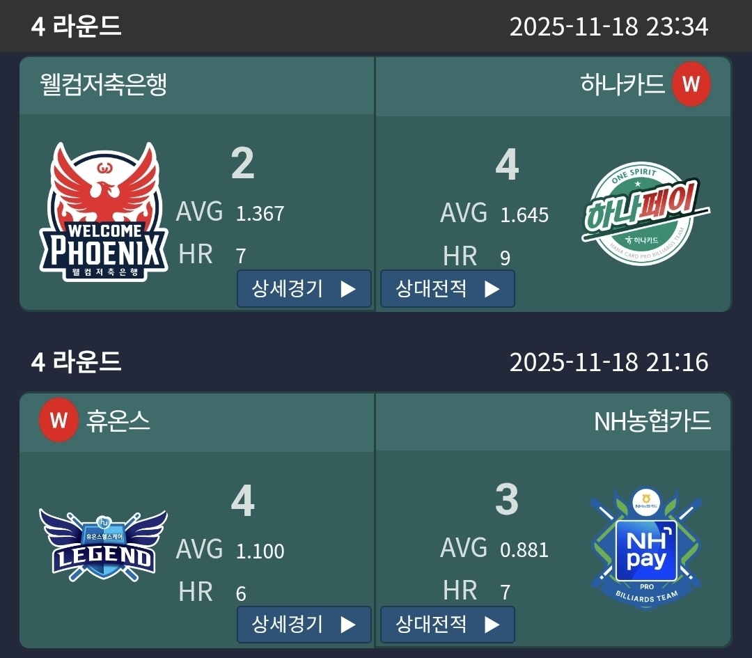 | PBA팀리그 4라운드 5일차 경기결과 및 팀 순위 (프로당구 2025-26) (0) | 2025.11.21 |